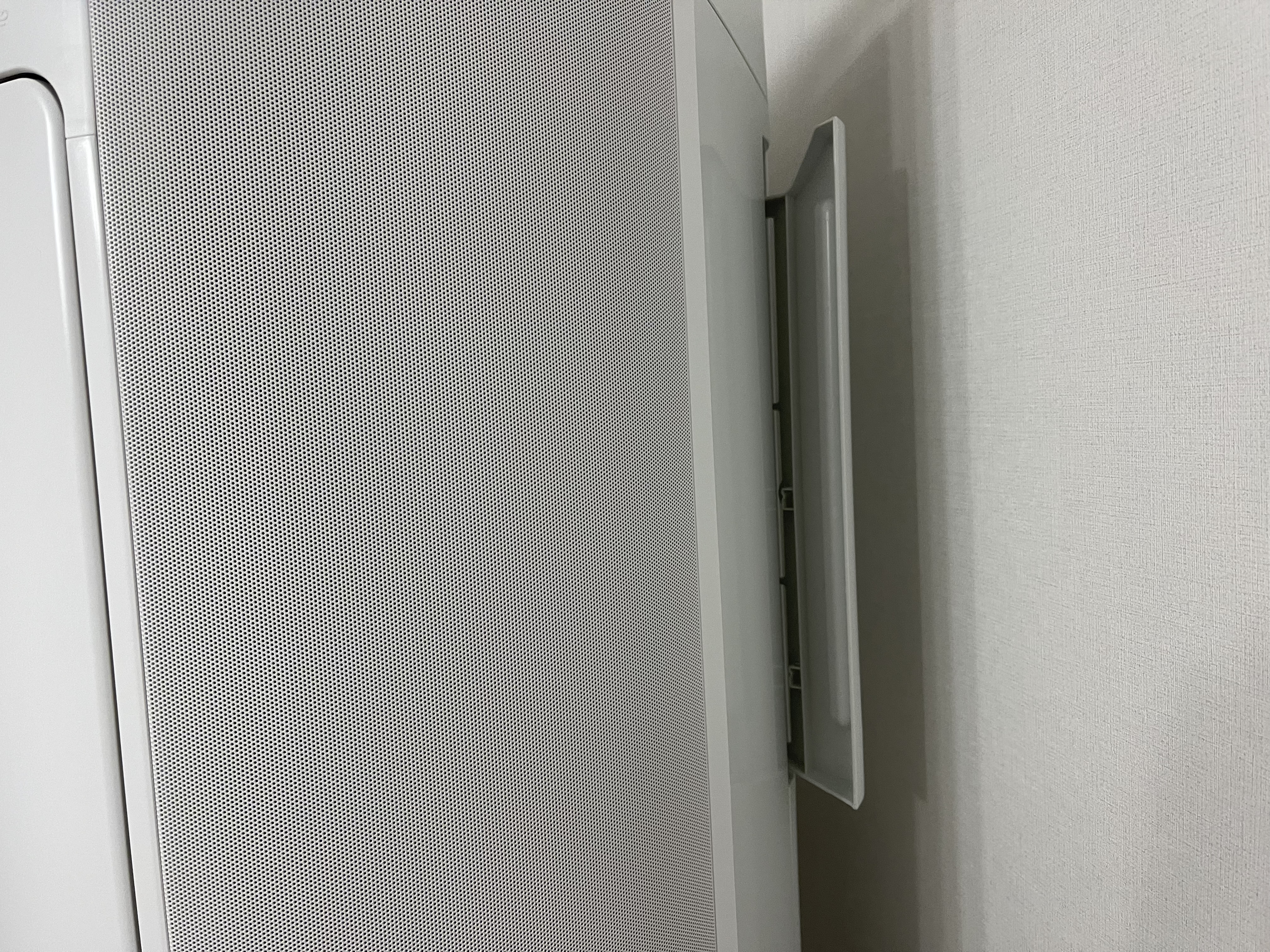 필터의 경우 에어컨 뒷면 오른쪽에 장착되어 있다. 에어컨 필터의 탈부착이 정말 간편해서 이거는 참 공항적으로 잘 만들었다고 칭찬해 주고 싶다. 벽걸이형 에어컨의 경우 필터 청소를 할 때마다 상당히 불편하다고 느꼈는데 이 방식으로 필터를 분리해보니 너무 편리하다.