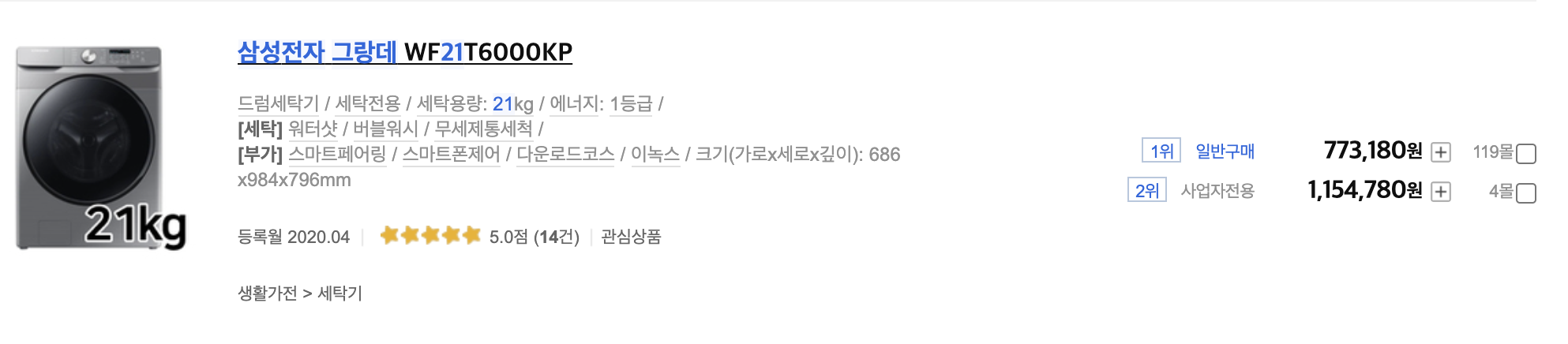 근데 해당 제품을 구매하면서 의아했던 부분이 있는데 내가 조사했을 당시에 그랑데 19kg 모델이 21kg 모델보다 가격이 3만 원에서 5만 원가량 비쌌다는 것이다. 두 제품의 경우 성능도 위의 사진과 같이 전부다 동일하고 심지어 세탁기의 크기조차 똑같았다. 세탁용량만 차이가 나는데 오히려 세탁용량이 더 높은 제품이 가격은 더 낮았고 상당히 안 팔린 것을 볼 수 있었다 삼성전자 그랑데 WF21T6000KP 제품의 경우 리뷰 건수가 14건에 불과하고 삼성전자 그랑데 WF19T6000KP 제품의 경우 리뷰 건수가 2500건이나 된다. 단순히 19kg 제품이 많이 팔려서 다들 19kg 제품을 구매한 건지 아니면 21kg 제품의 경우 하자가 있어서 안 팔린 건지는 조사해봐도 알 수 없었다.