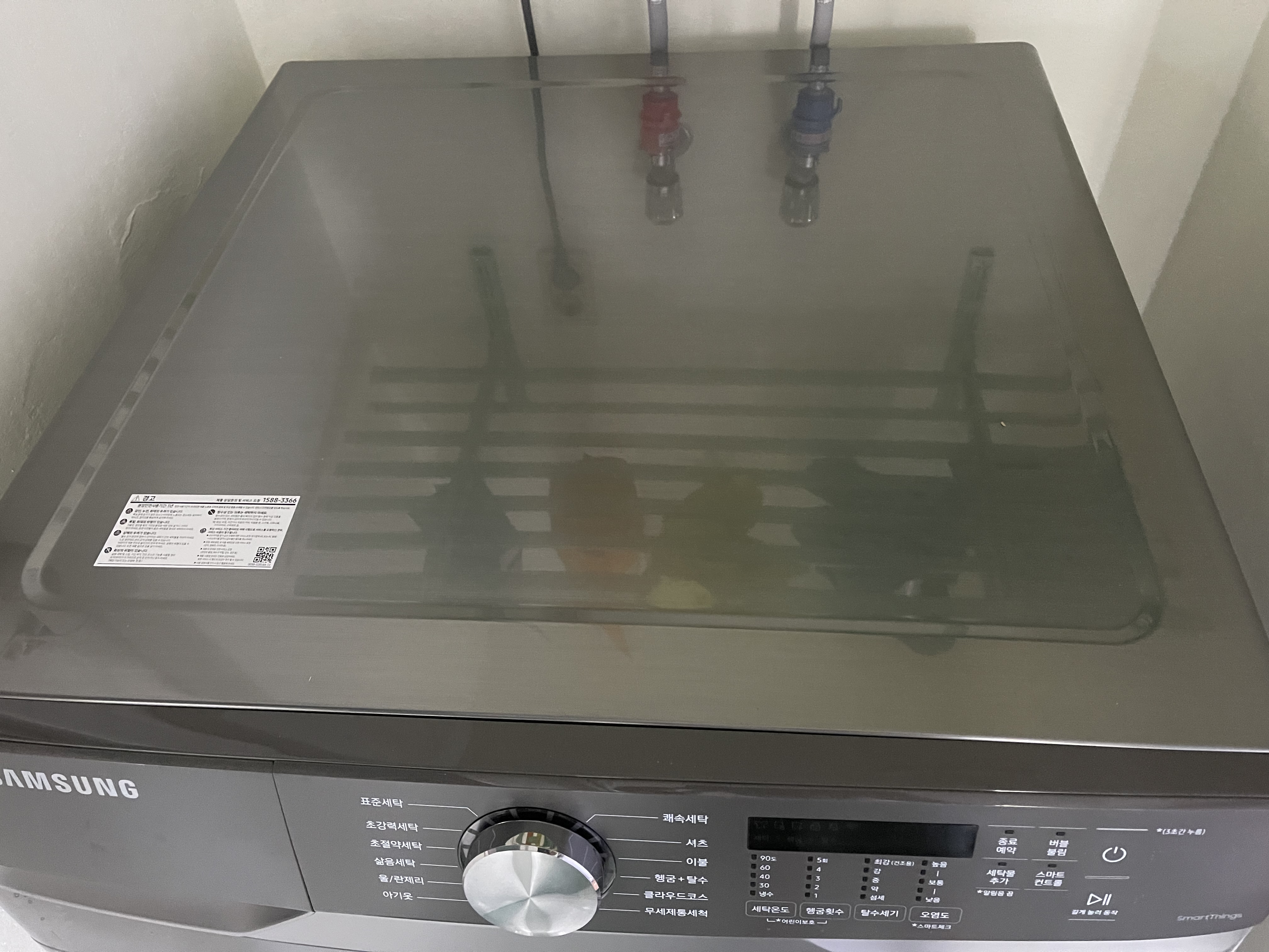 이렇게 쿠션을 놔둠으로써 세탁기문에 기스가 생기지 않도록 했다.