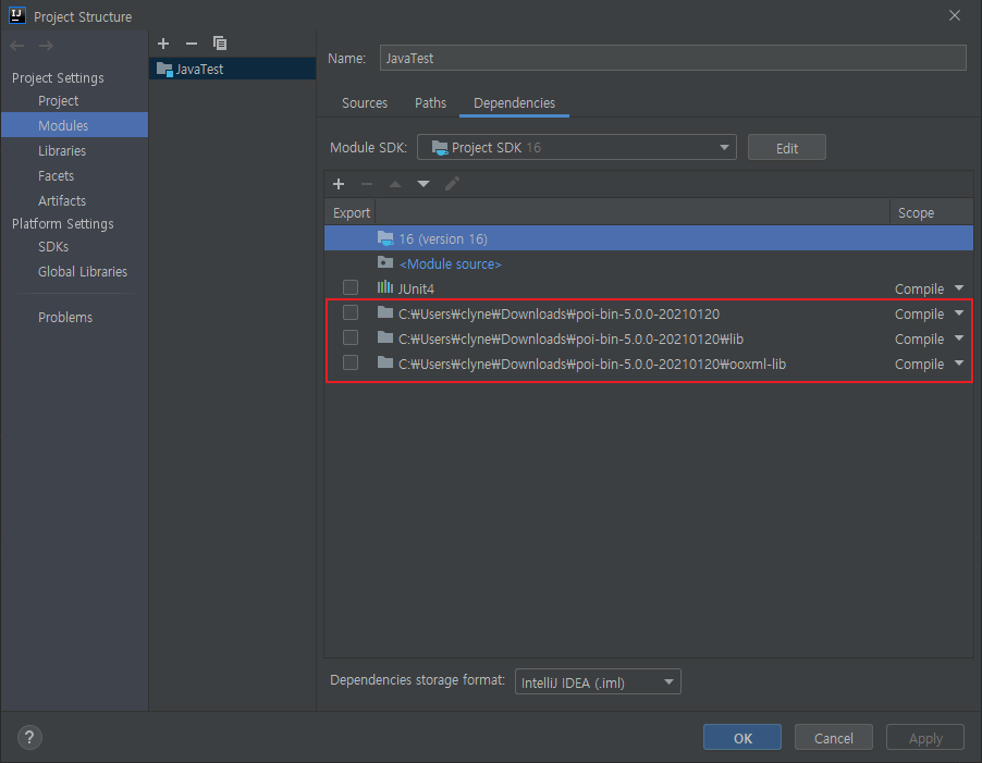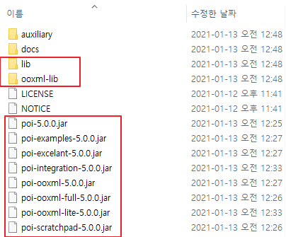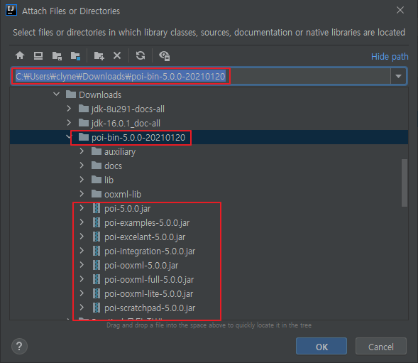 C:\Users\clyne\Downloads\poi-bin-5.0.0-20210120, C:\Users\clyne\Downloads\poi-bin-5.0.0-20210120\lib, C:\Users\clyne\Downloads\poi-bin-5.0.0-20210120\ooxml-lib 이렇게 총 3개의 라이브러리들이 추가되었다.