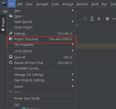 인텔리제이의 메뉴에서 File->Project Structure...을 클릭하자. 클릭이 귀찮다면 위에 적혀있는 단축키대로 Ctrl + Alt + Shift + S 를 눌러주자.