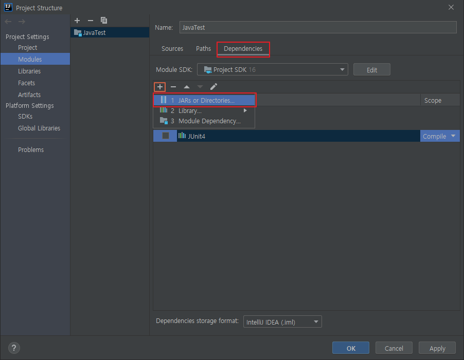 그리고 Dependencies -> + -> JARs or Directories... 을 클릭하자.