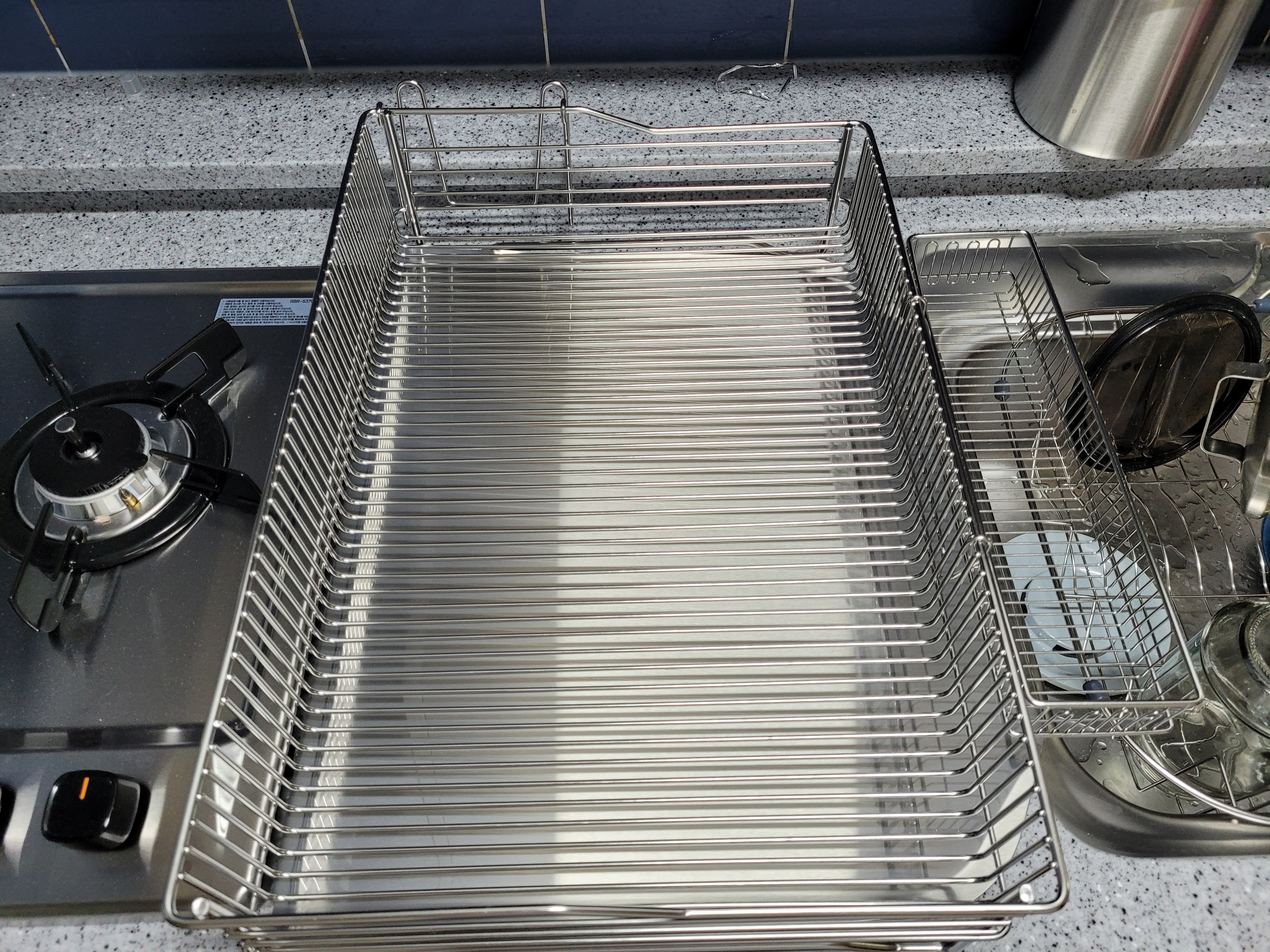 이번에 구매한 자주 식기건조대의 장점은 역시 큰 사이즈이다. 식기건조대의 사이즈가 작을 경우에 식기 몇 개만 씻어도 놔둘 곳이 없어서 상당히 불편하다. 냄비 한개만 씻어도 그릇을 놔둘 공간이 없어져버린다. 마감의 경우에는 저가형과 다르게 손이 베일 것이라고는 생각되지 않는 마감이다. 손으로 직접 만져봤는데 날카롭다고 생각되는 부분은 없었다. 자주 식기건조대의 아쉬운 점이 있다면 바로 물받이가 식기건조대 전체 사이즈보다 작다는 점이다. 식기를 씻고 난 후에 제일 끝자리에 식기를 거치해두게 되면 물이 물받이 밖으로 떨어질 수 있다.