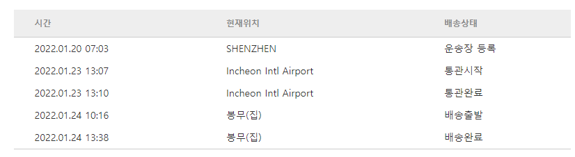 위의 사진을 보면 1월 22일 토요일 도착 예정이라 되어있는데 과연 3일만에 도착을 할 수 있을지 의문이 들었다.