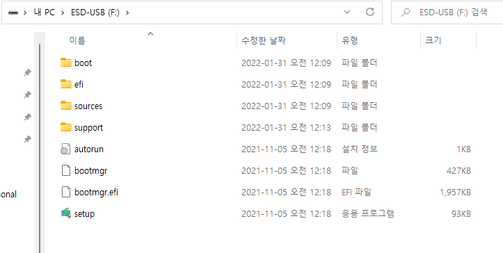 정상적으로 포맷 USB가 만들어졌다. 뭔가 이전에 윈도우10 포맷 USB를 만들때보다 훨씬 더 간단해진 느낌이다.
