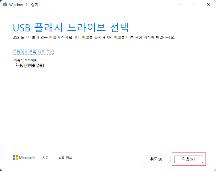 USB 플래시 드라이브 클릭 후 다음 클릭