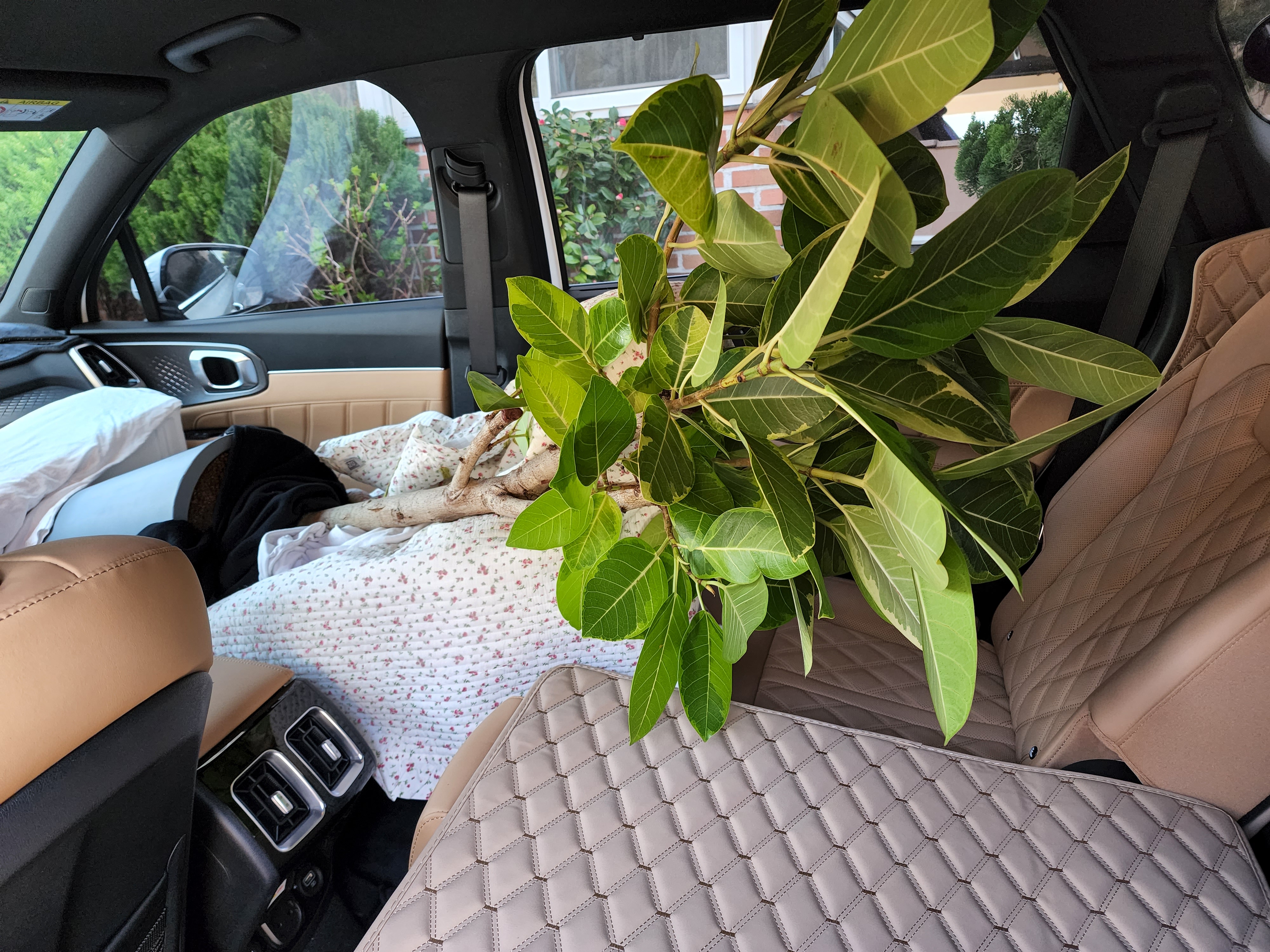 나무가 워낙 커서 차량에 어떻게 실어야 할까 고민을 했다. 트렁크에 눕혀서 실으려고 했는데 뱅갈고무나무의 잎이 바닥에 눌려 떨어질 것 같았다. 그리하여 싣게 된 방법은 앞 좌석에 눕혀서 싣는 것이었다.