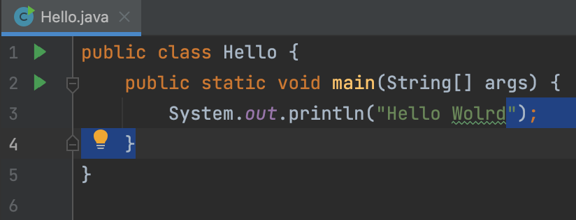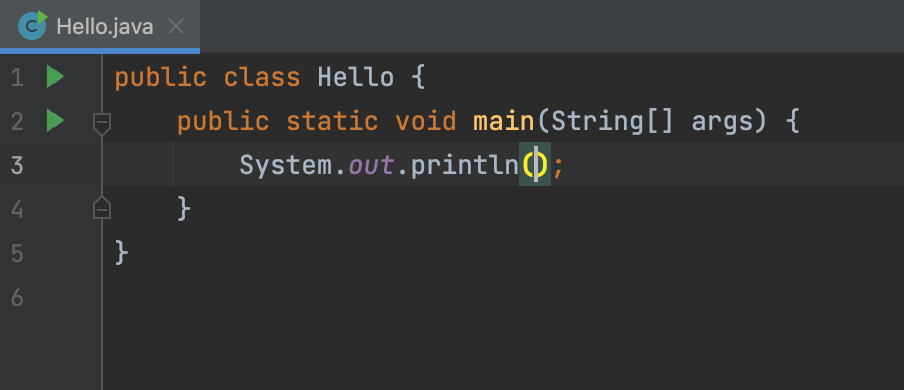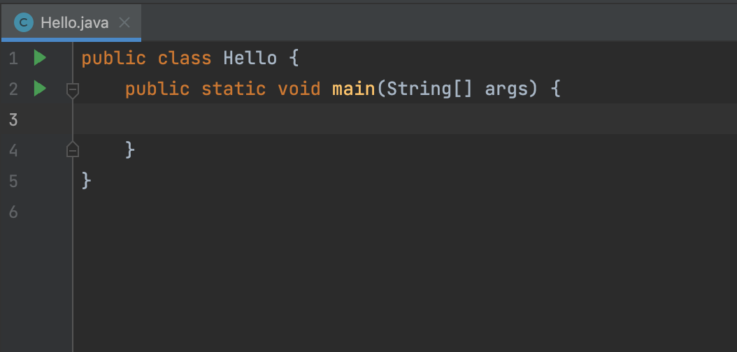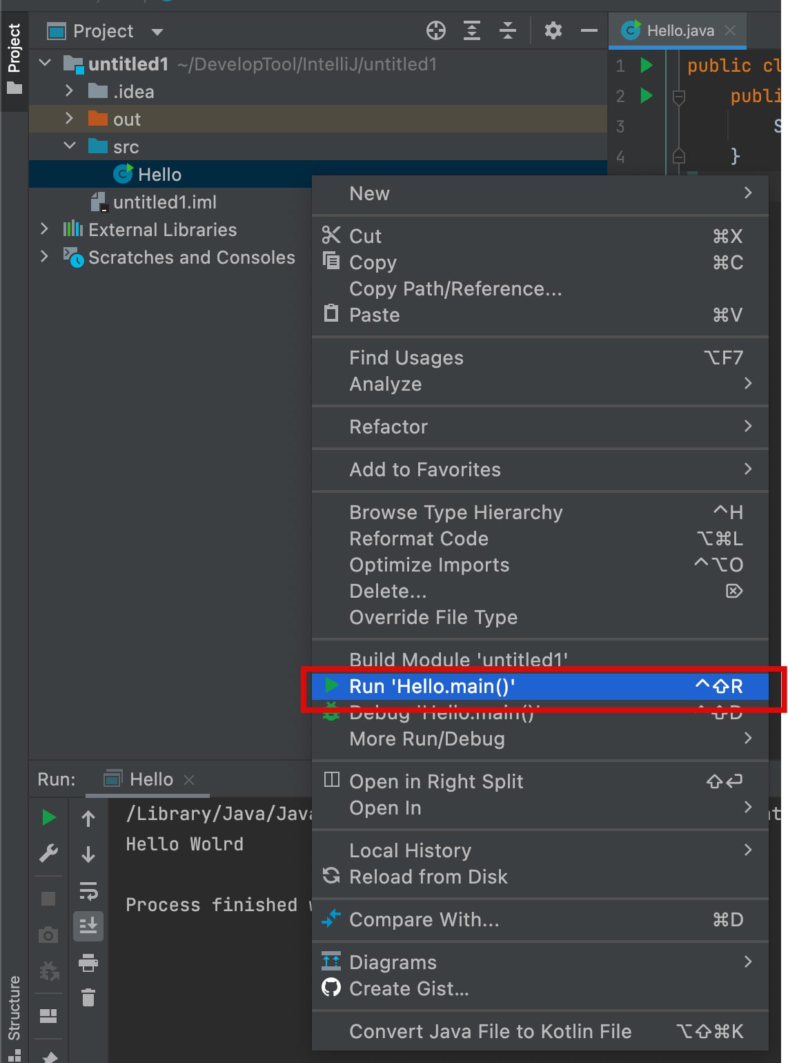 그럼 Run 'Hello.main()' 이라는 문장이 보이는데 클릭해주면 실행된다.