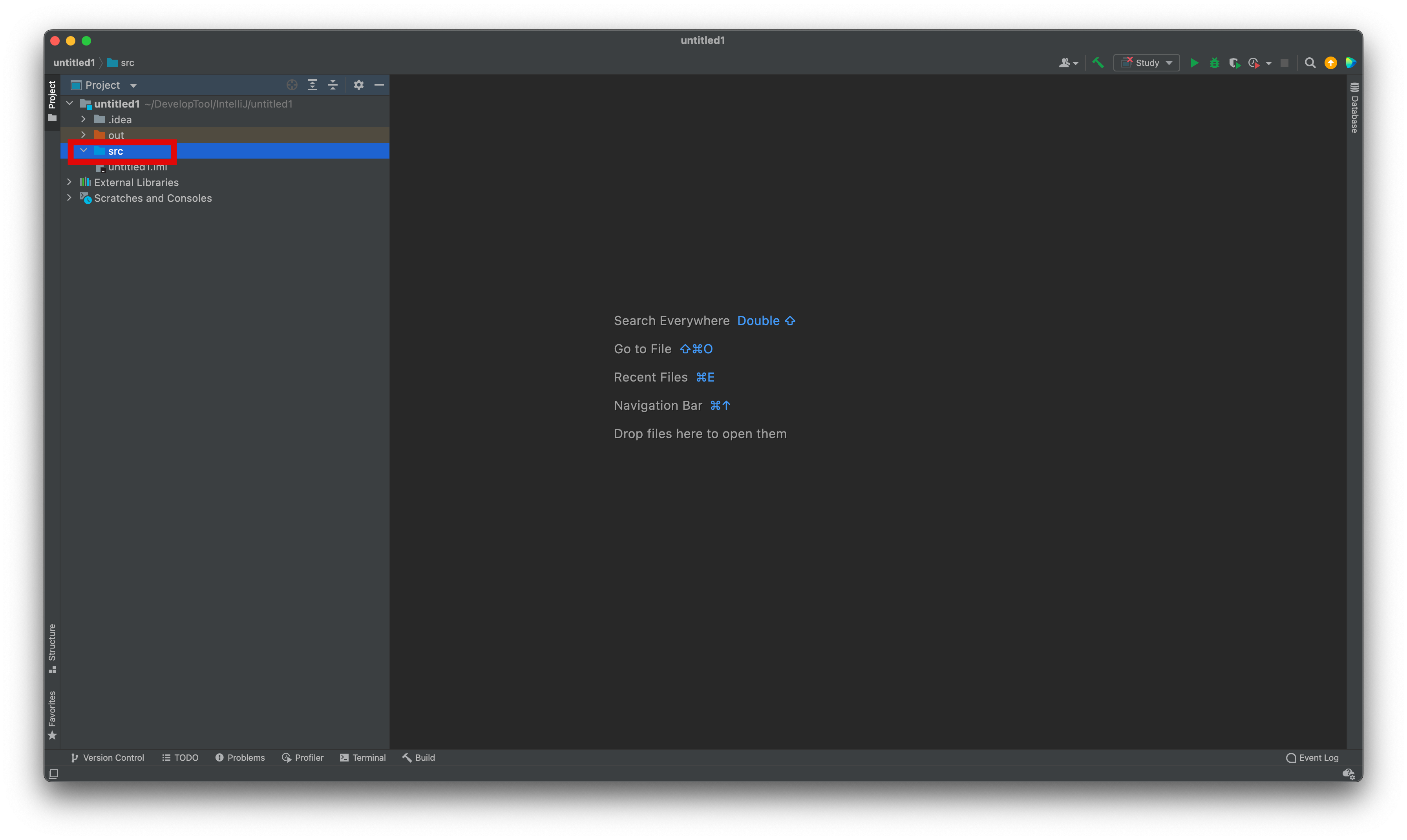 우선은 인텔리제이가 실행된 화면이다. 저기서 왼쪽의 src 폴더를 마우스 오른쪽 버튼으로 클릭하자.