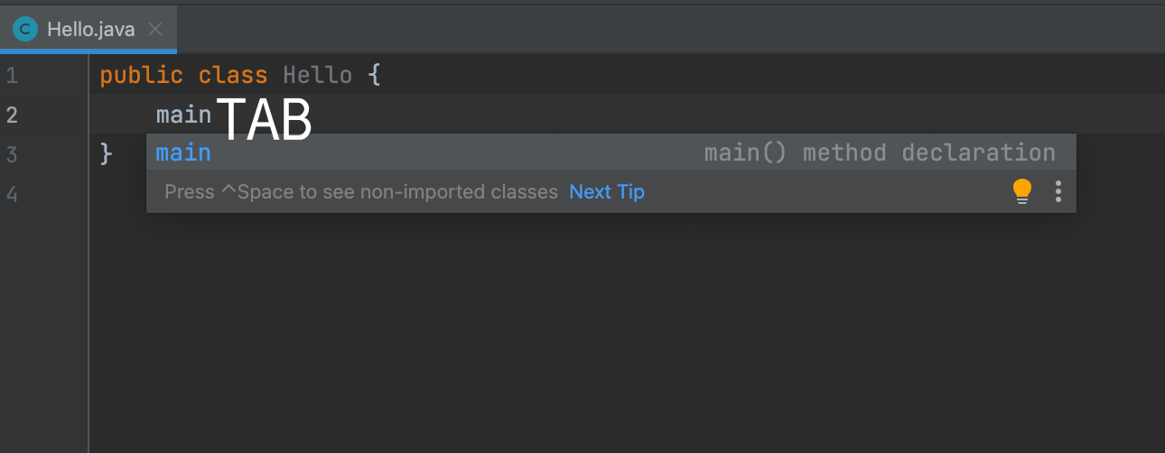 이라는 소스를 입력해야 한다. 이때 public static... 이렇게 다 입력할 필요 없이 main이라고 입력을 하면 아래에 드롭다운 목록이 나타난다. 이때 TAB 키를 눌러주면 자동완성 기능이 실행된다.