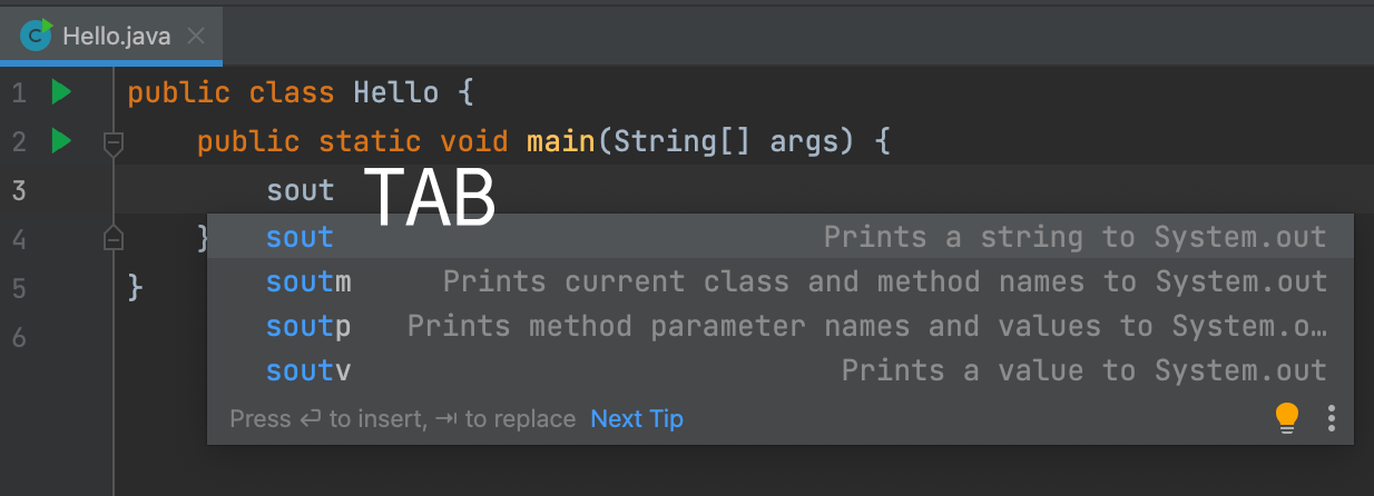 이번에는 sout를 입력하고 TAB 키를 눌러보자