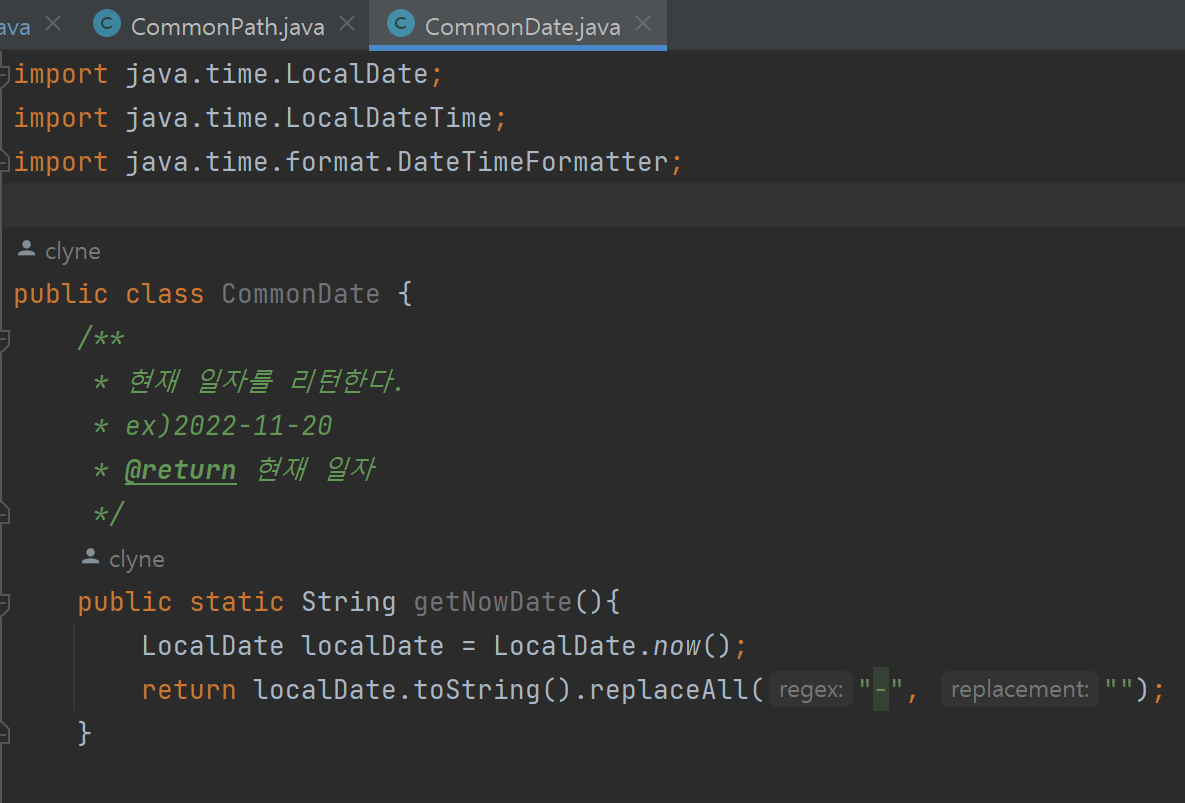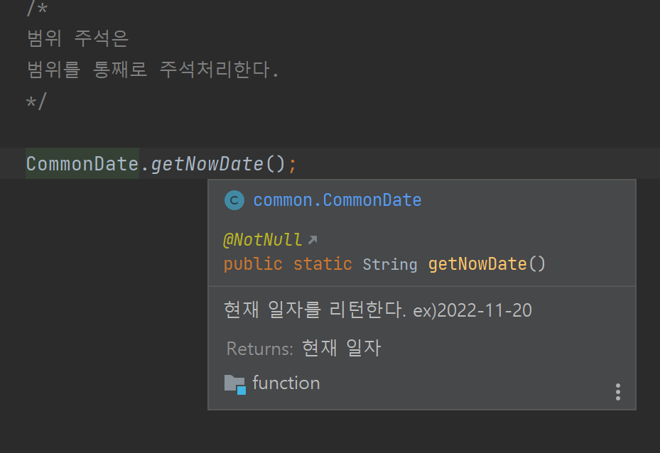 getNowDate라는 함수에 문서 주석을 작성했다.