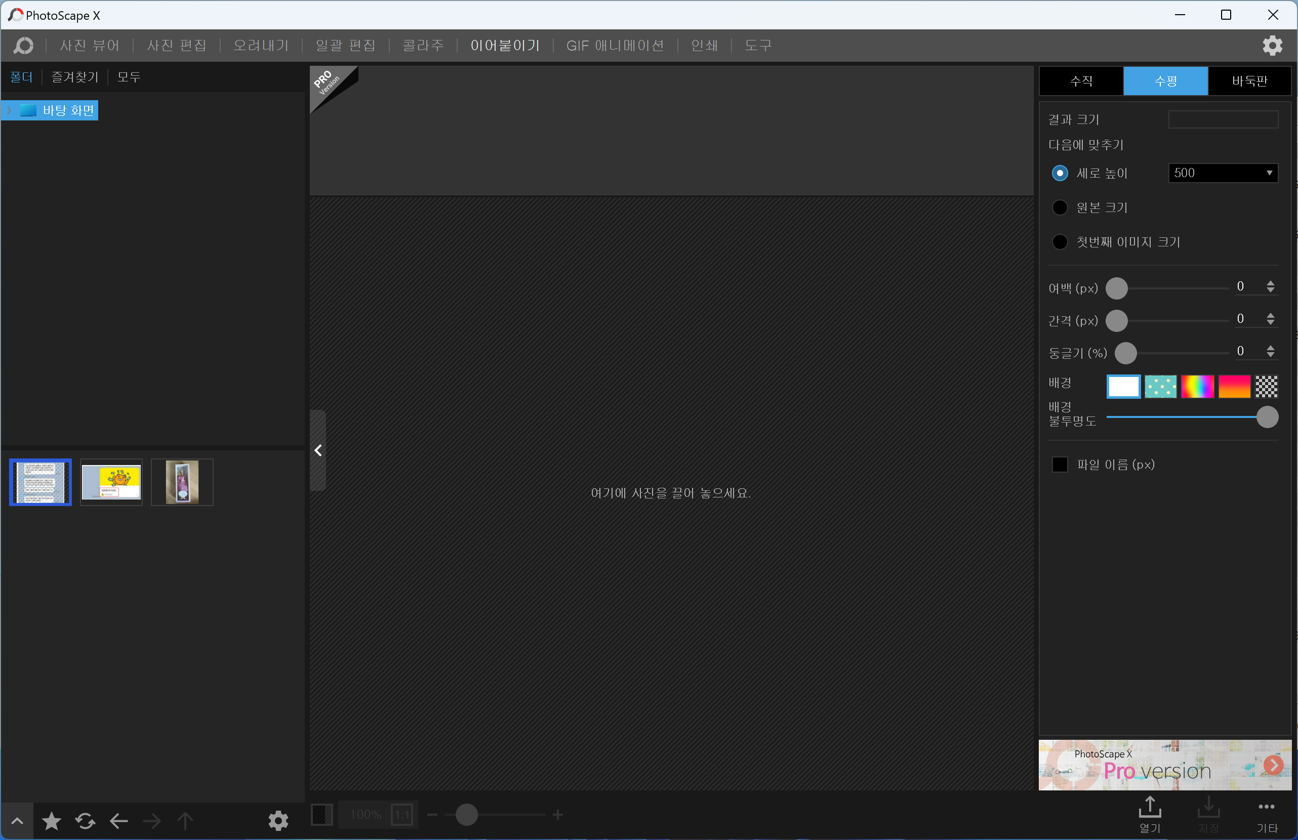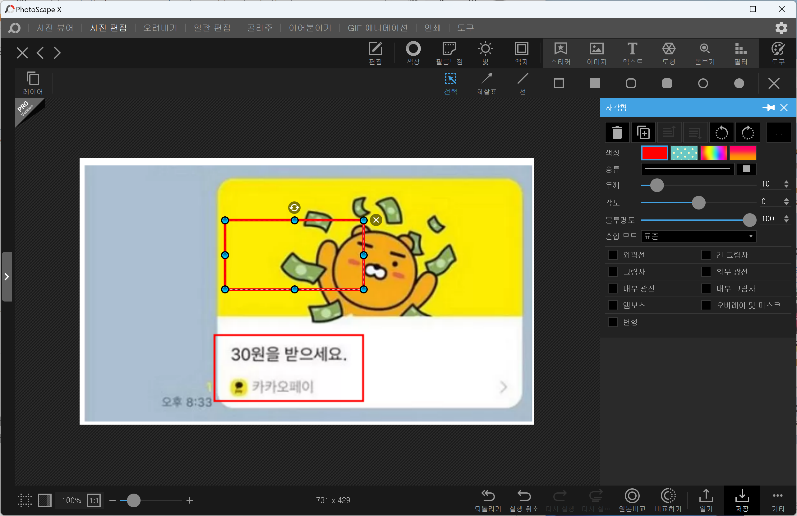 사진을 이어붙힐 수도 있고, 텍스트 첨부, 도형 첨부 등 기본적인 기능은 다 된다고 보면 된다.