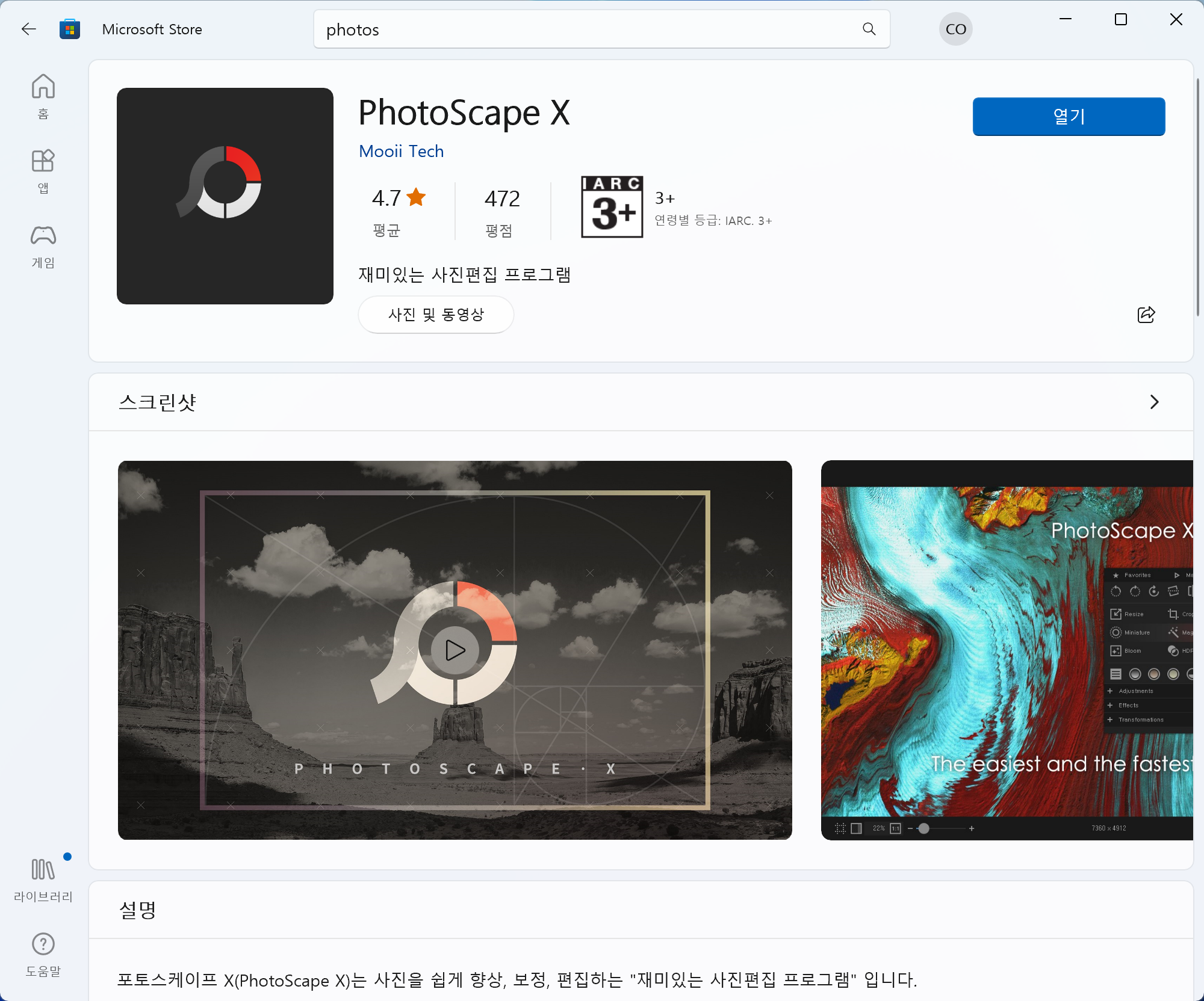 마이크로소프트 스토어에서 PhotoScape라고 검색하면 다운받을 수 있다.