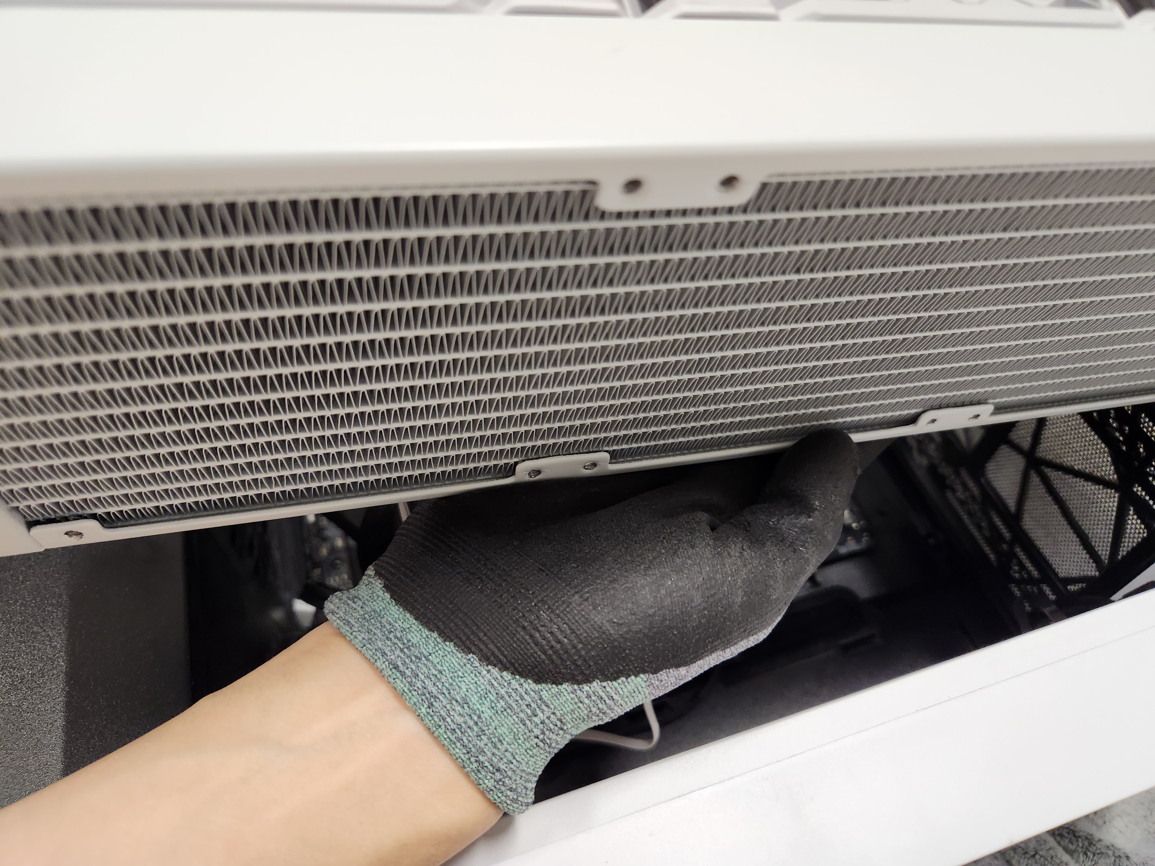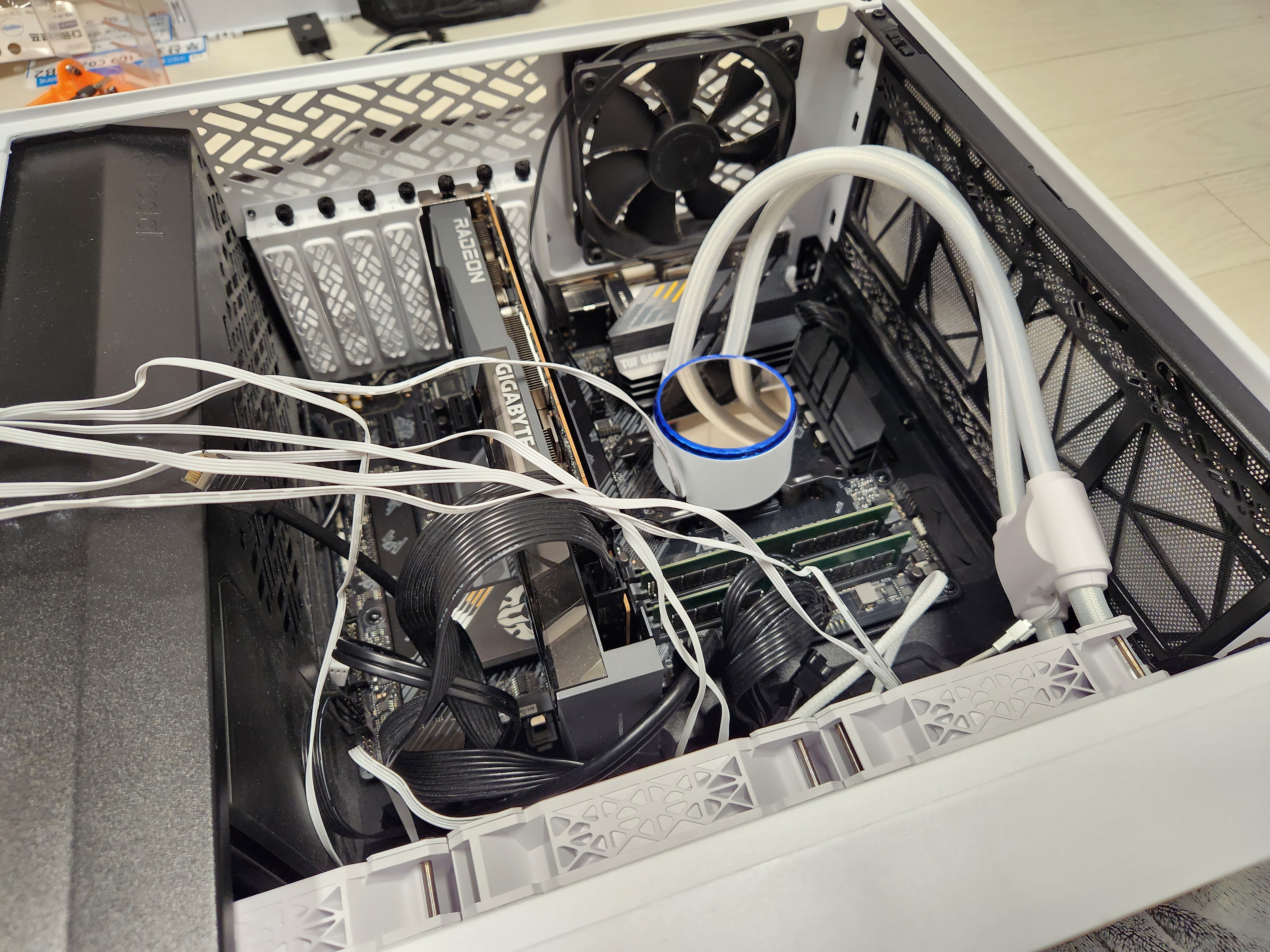 전면에 설치되어있는 라디에디터를 꺼내야하기에 케이스를 눕히고 작업을 했고 라디에디터를 꺼냇다.