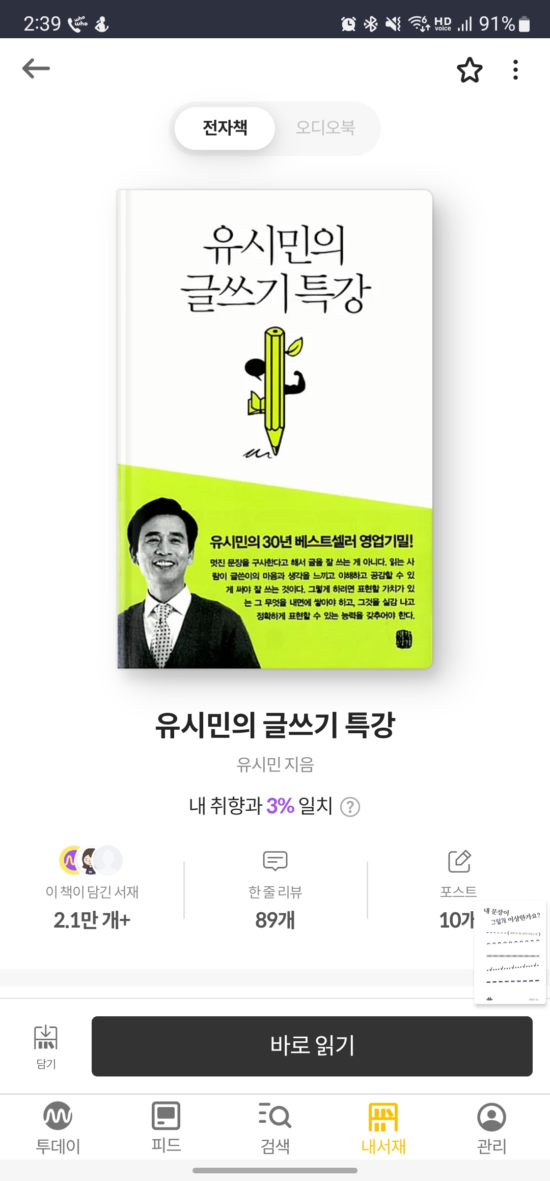 "유시민의 글쓰기 특강" 이 책의 경우에는 종이책으로 읽지 않고 밀리의 서재로 읽었다.