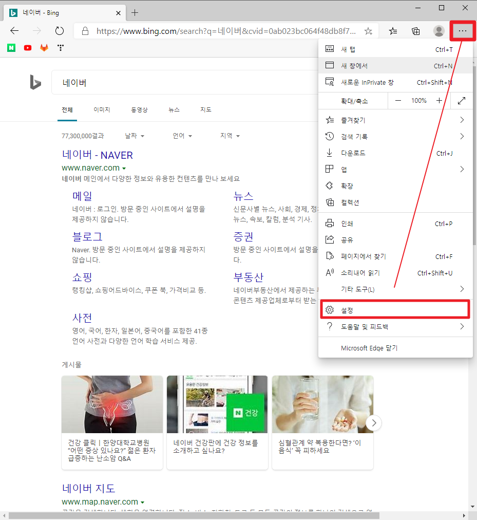 엣지브라우저는 처음 사용하면 기본 검색엔진이 bing으로 셋팅되어 있다.