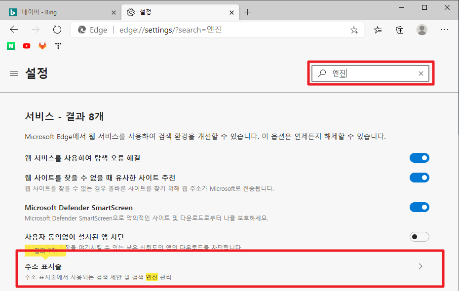 처음 시작하면 검색엔진이 bing로 나타나게 되는데 이 부분을 변경해보자