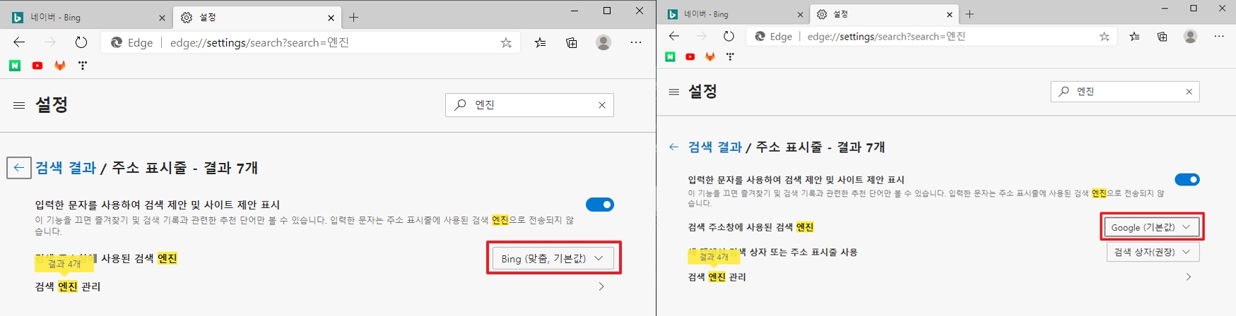 엣지브라우저는 처음 사용하면 기본 검색엔진이 bing으로 셋팅되어 있다.