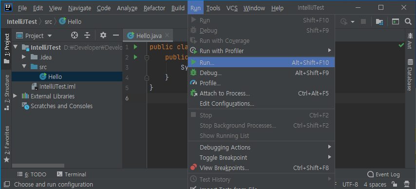 제일 위의 메뉴에서 Run->Run...을 클릭해주자