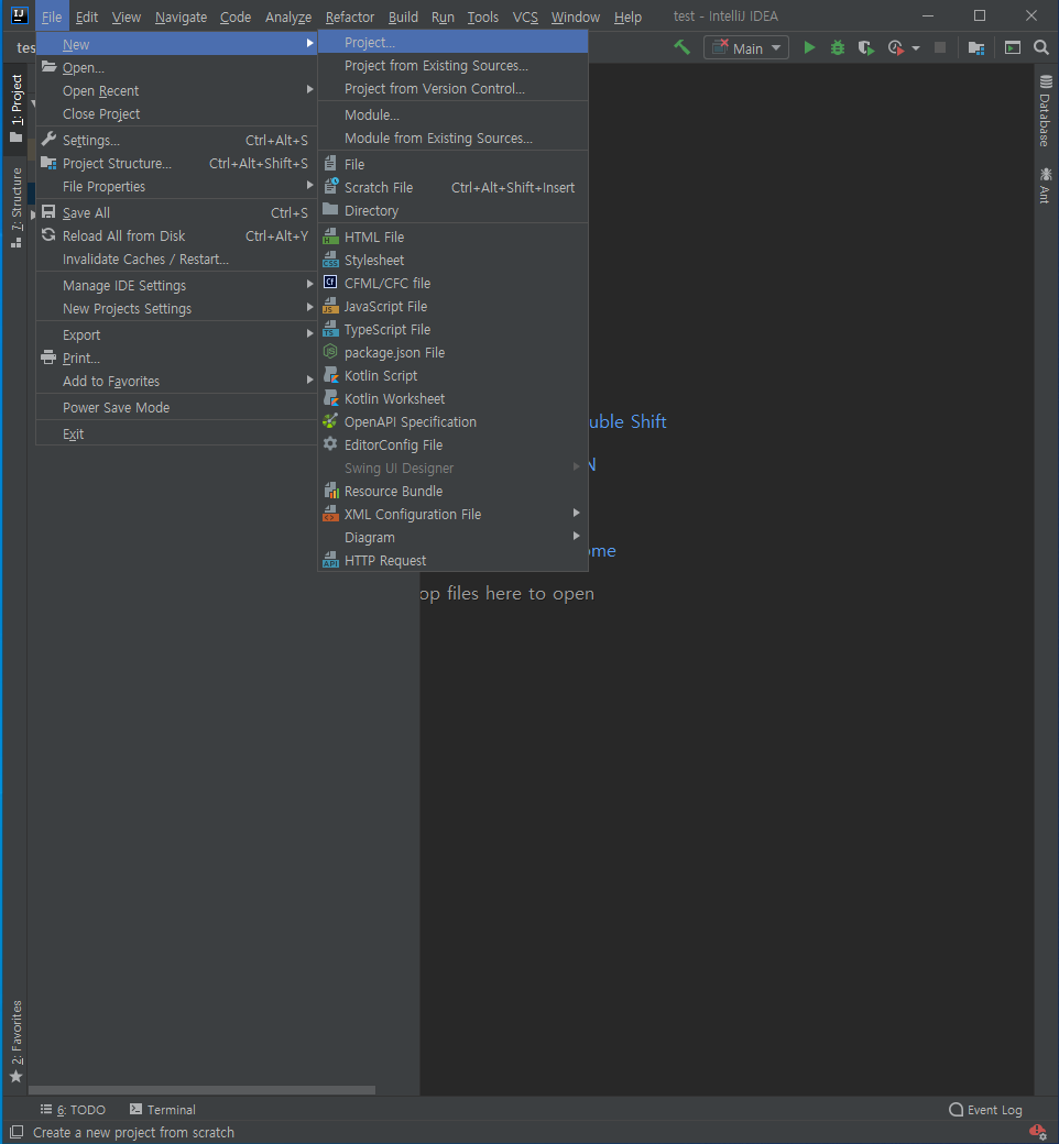 우선 인텔리제이를 실행하고 File->New->Project를 클릭해준다.