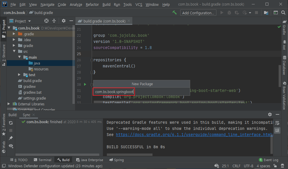 패키지명을 적어주면 되는데 나의 경우에는 com.bs.book.springboot로 선택했다.