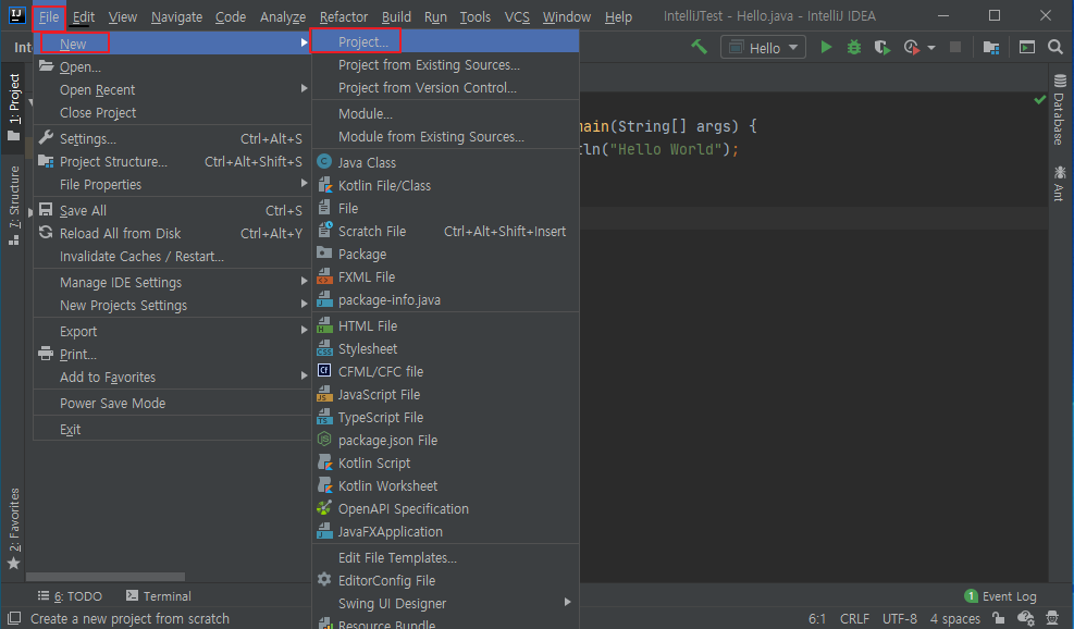 우선은 인텔리제이를 시작하고 인텔리제이 메뉴에서 File->New->Project를 클릭하자