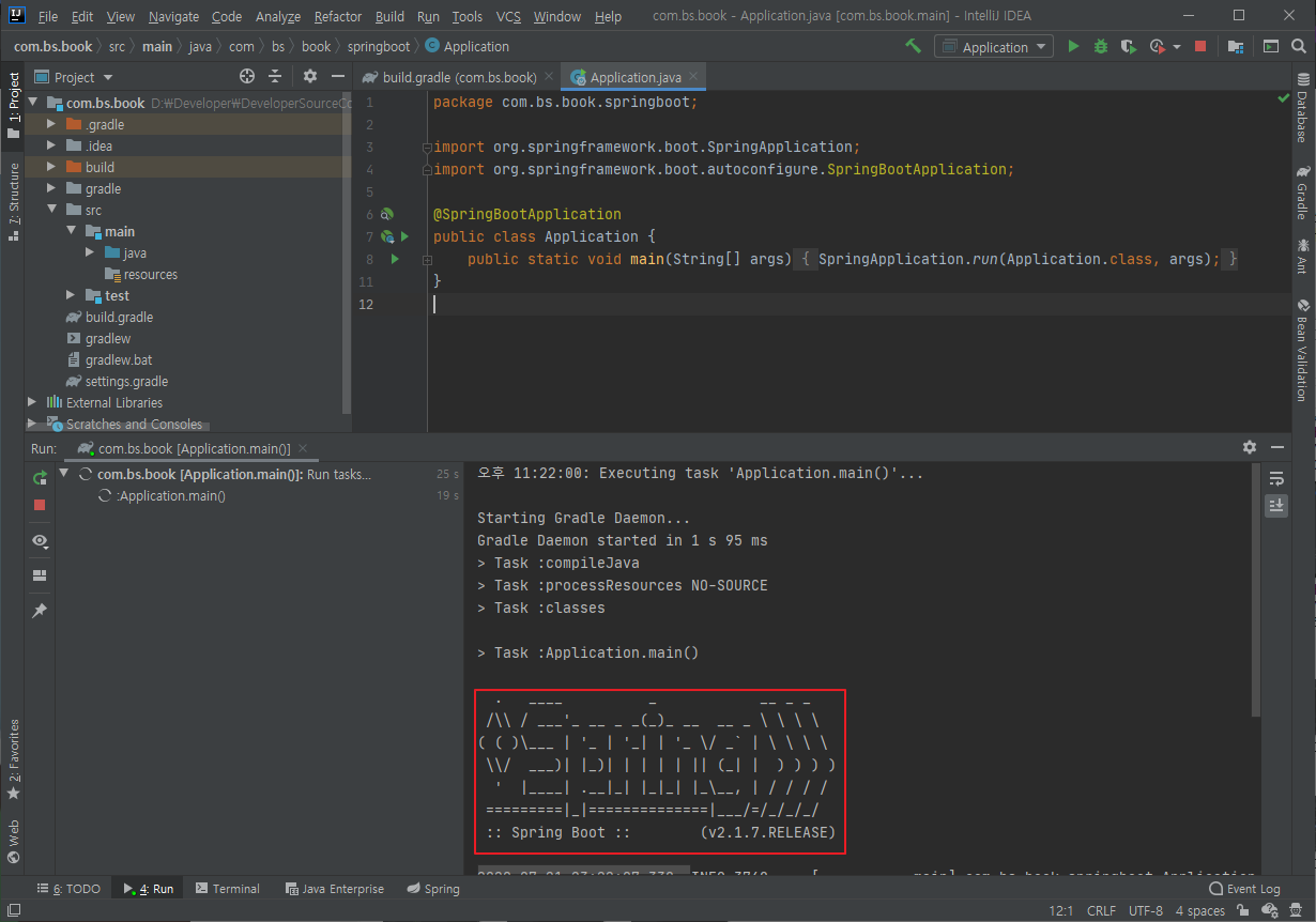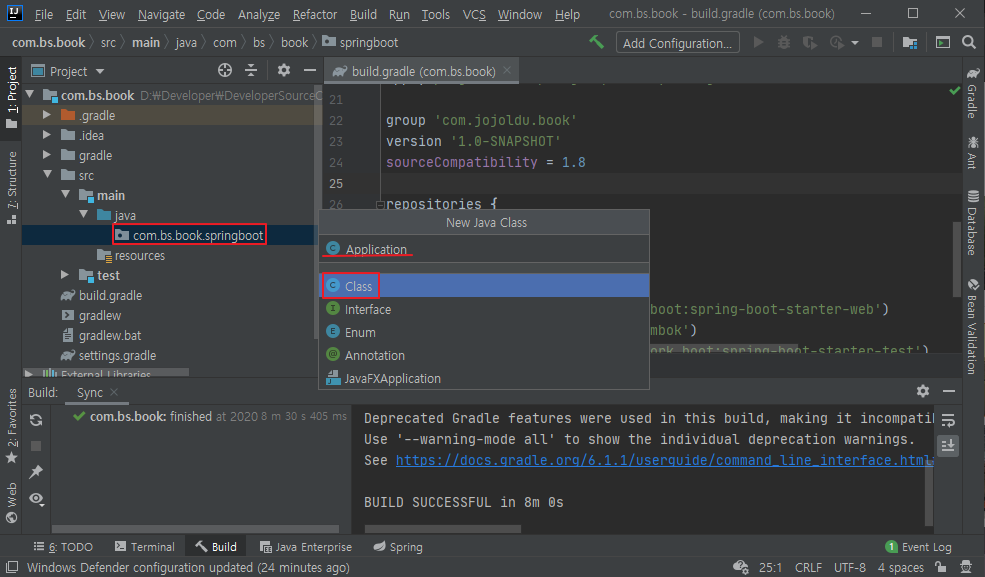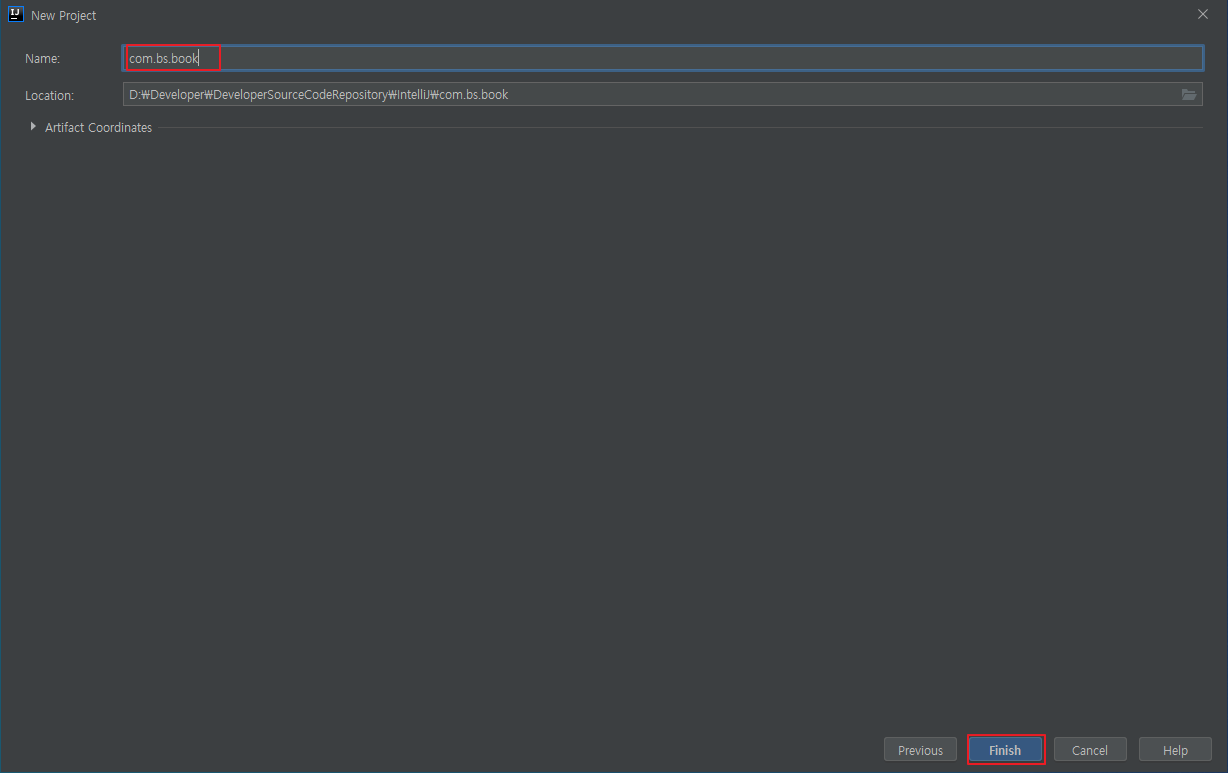 패키지명을 적어주면 되는데 나의 경우에는 com.bs.book.springboot로 선택했다.
