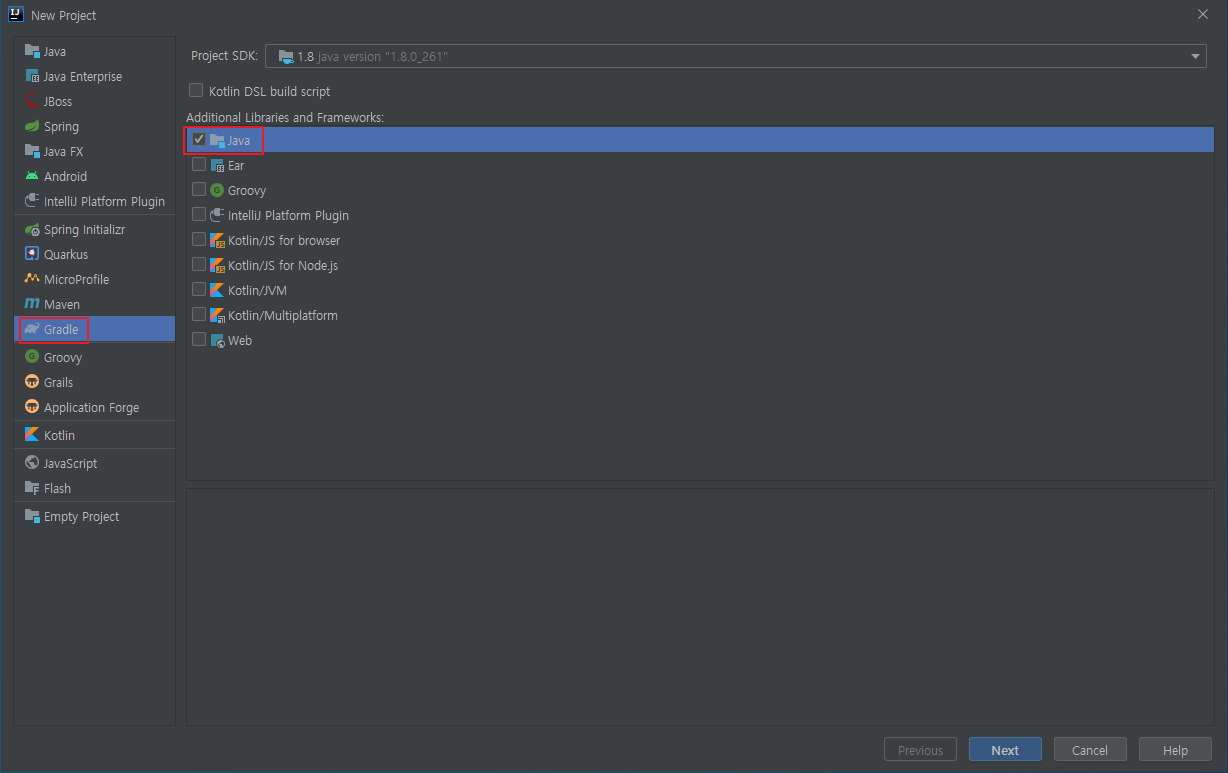 그리고 왼쪽 메뉴박스에서 Gradle를 클릭하고 메인박스에서 Java를 클릭하자