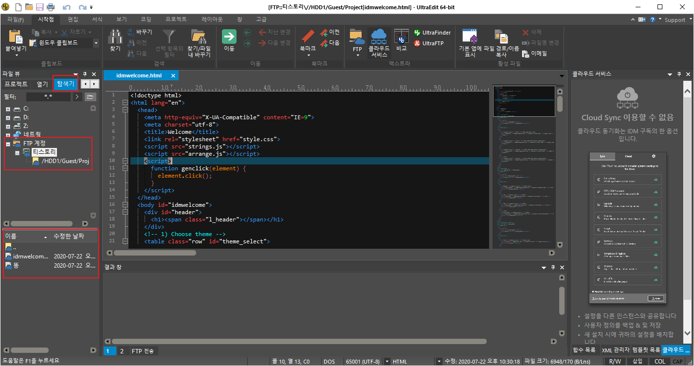 그러면 울트라 에디트의 탐색기 창에 FTP로 연결된 서버의 디렉터리 구조가 나타난다.