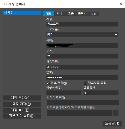 그다음 서버 IP와 포트, 사용자명, 암호를 입력해주자