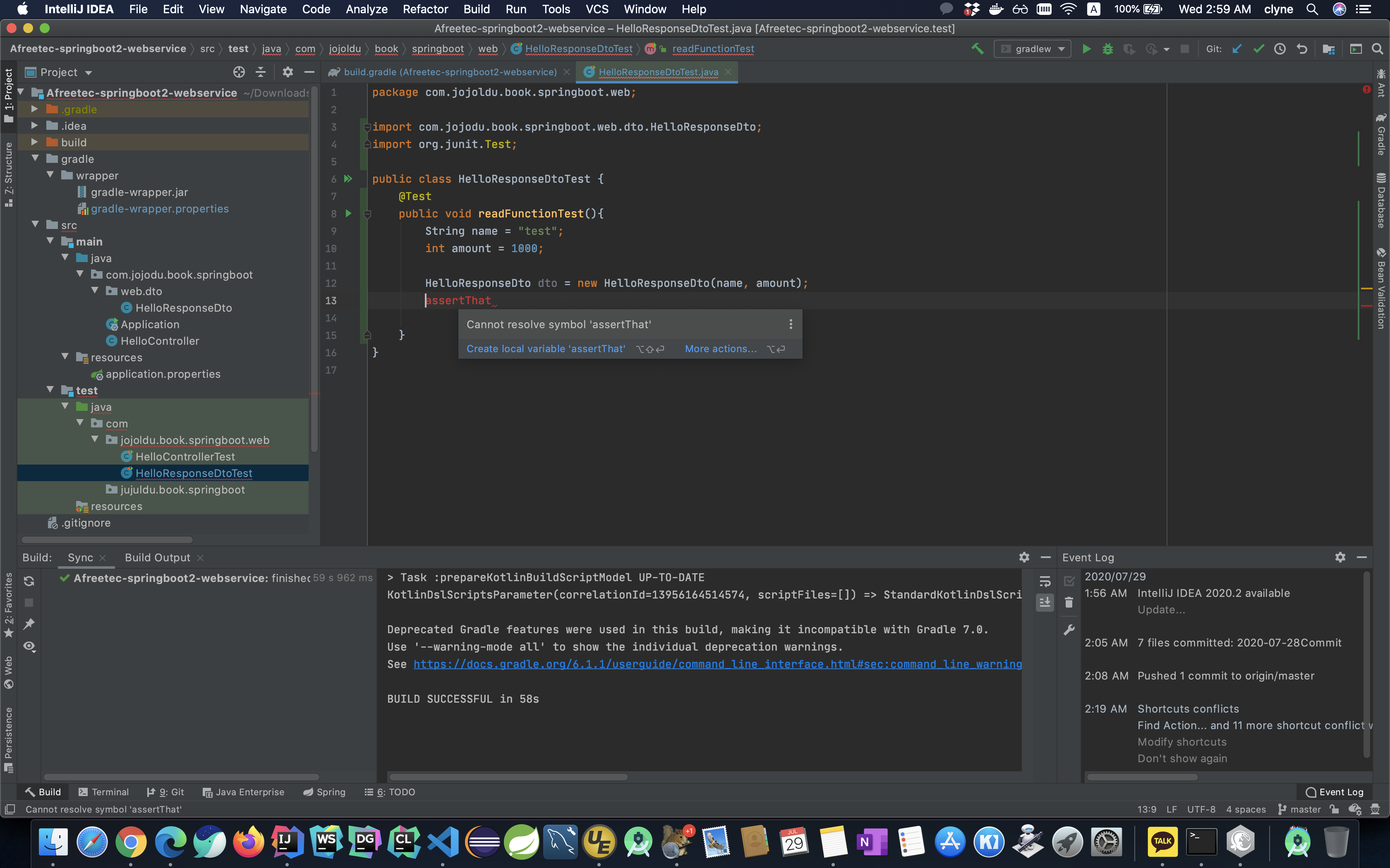 현재 화면을 보면 Cannot resolve symbol 'assertThat' 라는 문구가 출력되는 것을 볼 수 있다.