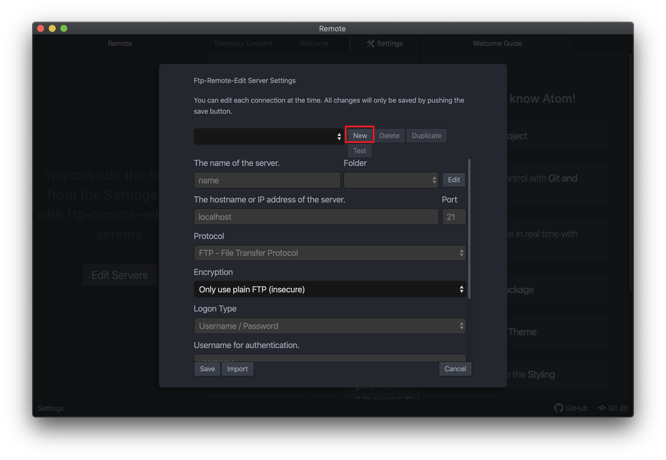 ftp연결을 설정하는 화면이 나타나는데 New를 클릭해주자