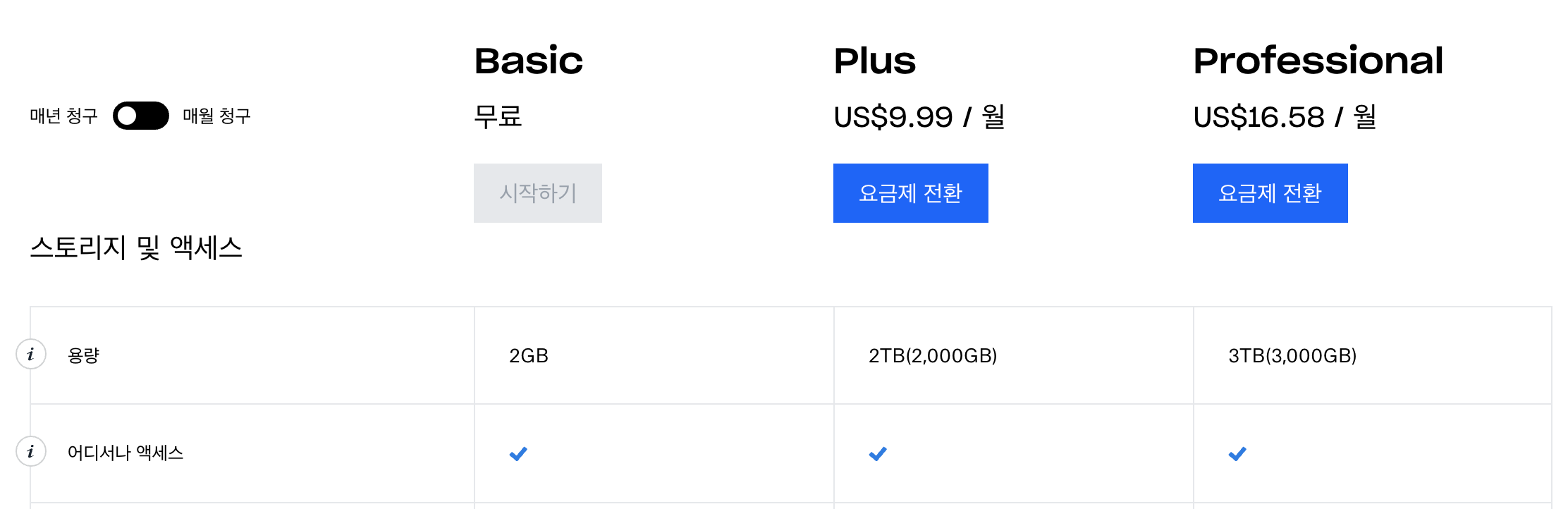 무료 버전의 경우 50GB라는 글을 본 적이 있는데 내가 알아봤을 때는 2GB였다