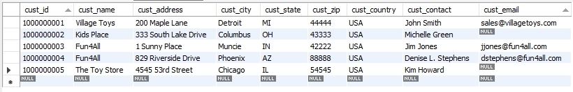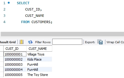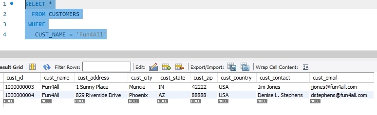 CUSTOMERS에 대해서 CUST_NAME에 Fun4All이 들어있는 것을 전체 선택하겠다.