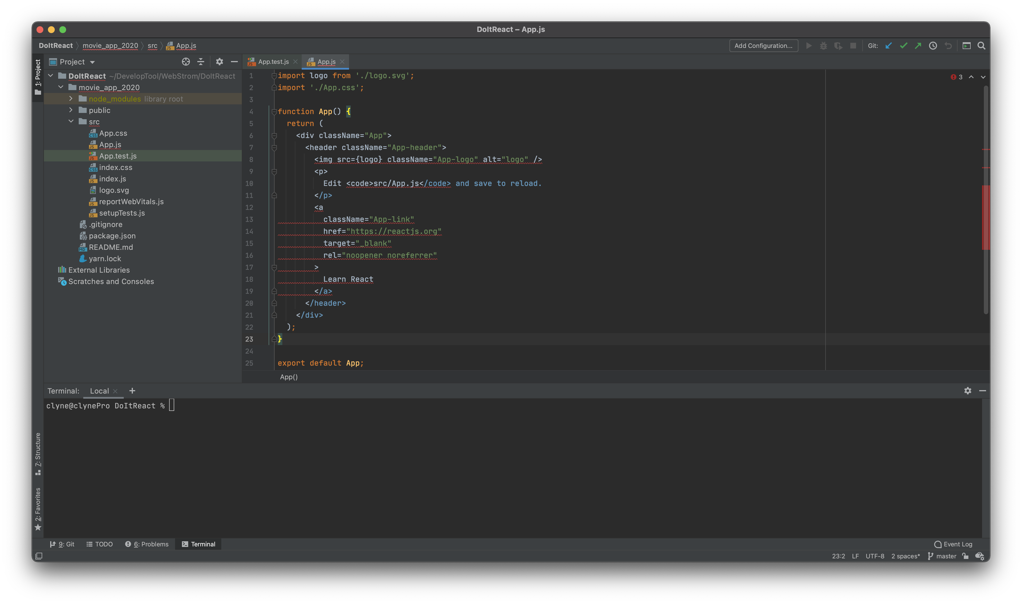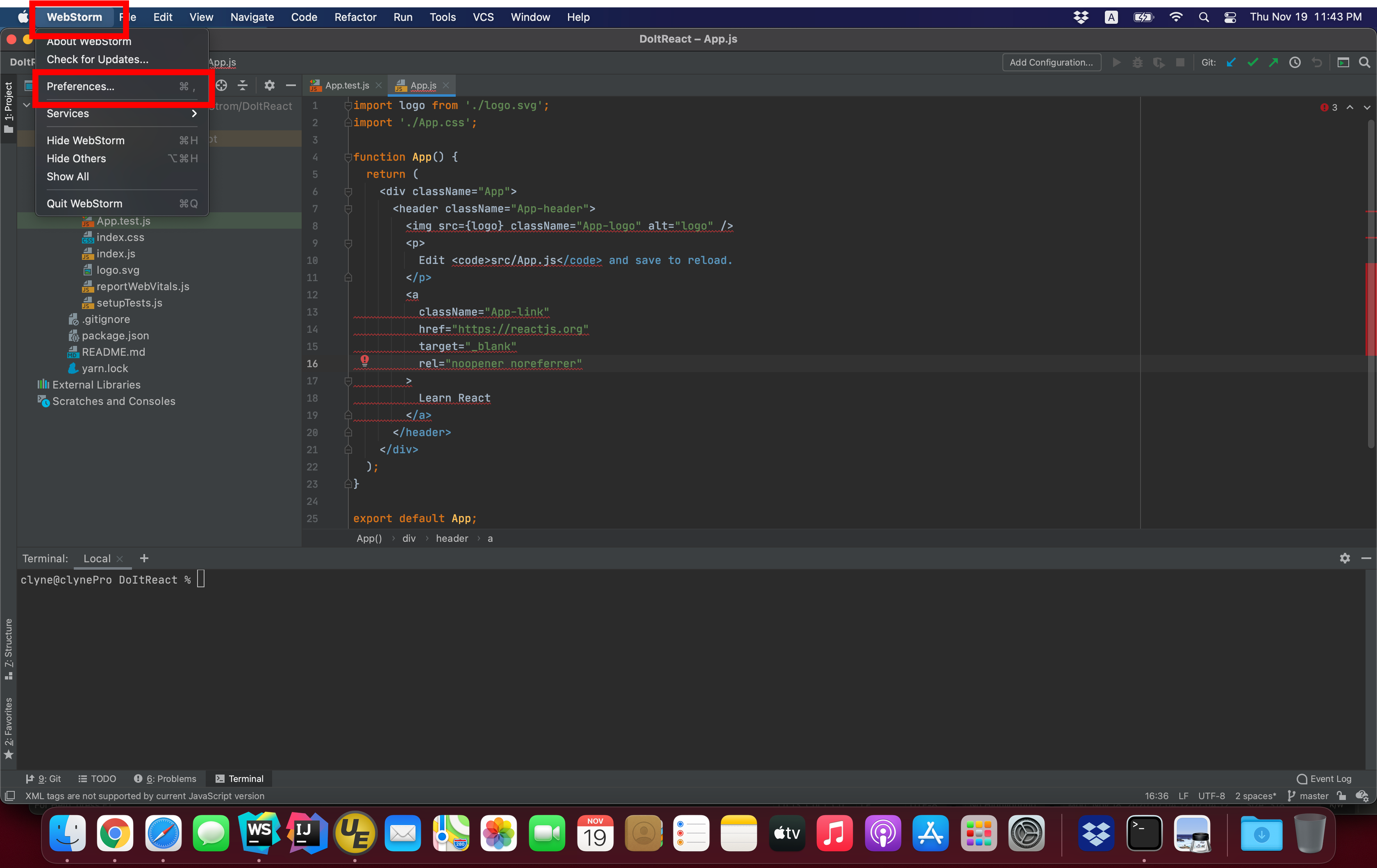 웹스톰에서 리액트 문법에 에러가 발생하는 모습을 볼 수 있다.