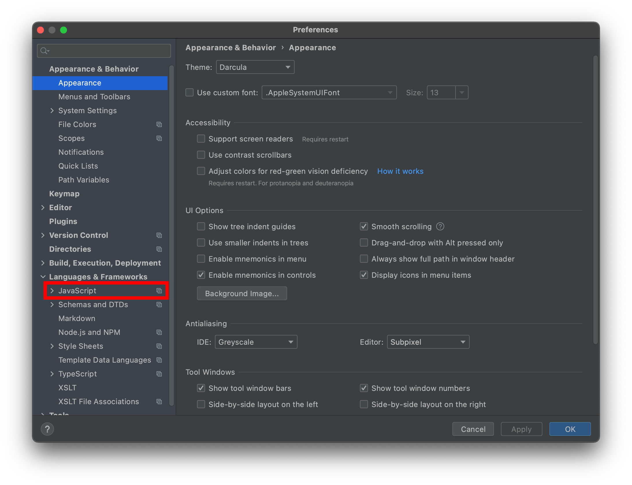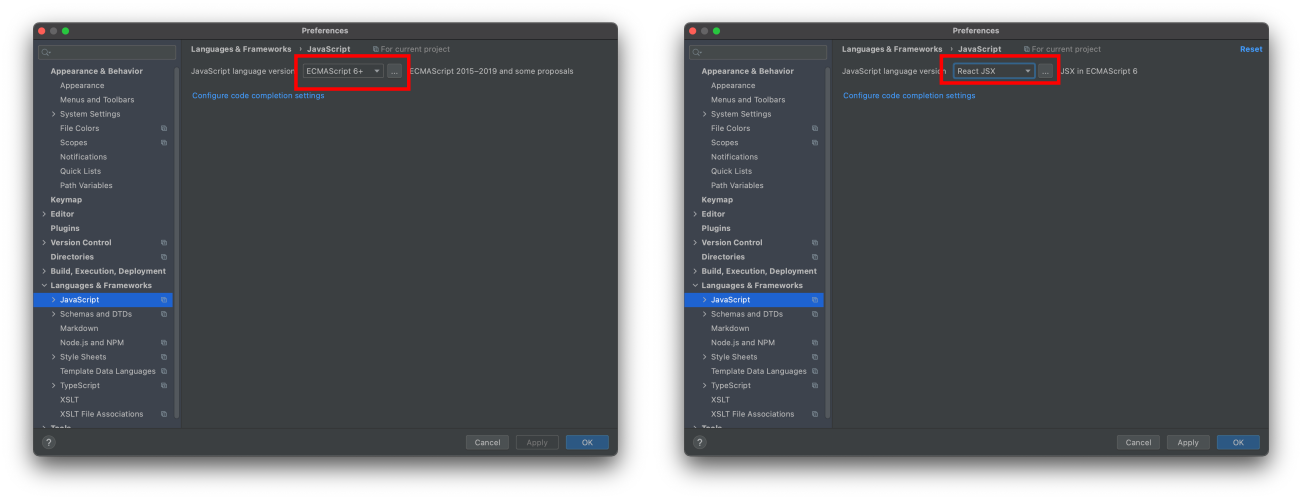 그러면 위와 같은 화면이 뜨는데 Languages & Frameworks ->JavaScript를 클릭해주자.