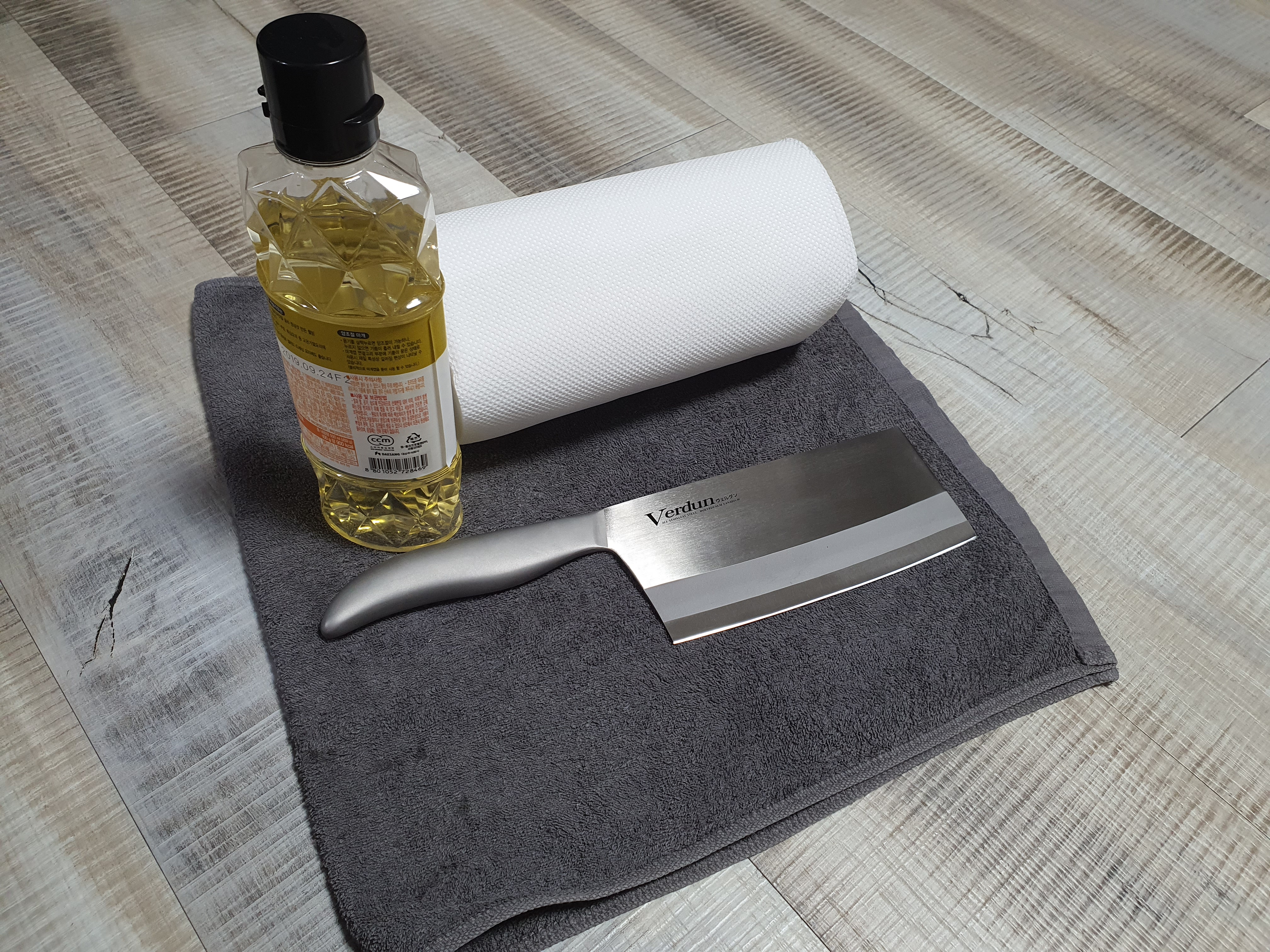 중식도의 경우 칼이 상당히 크기 때문에 연마제가 많이 묻어 있을 것 같아 연마제 작업을 진행했다. 우선은 연마제 제거 작업에 필요한 식용유와 키친타올 그리고 식용유가 바닥에 묻으면 안되기 때문에 쓰지 않는 수건을 바닥에 깔아두었다.