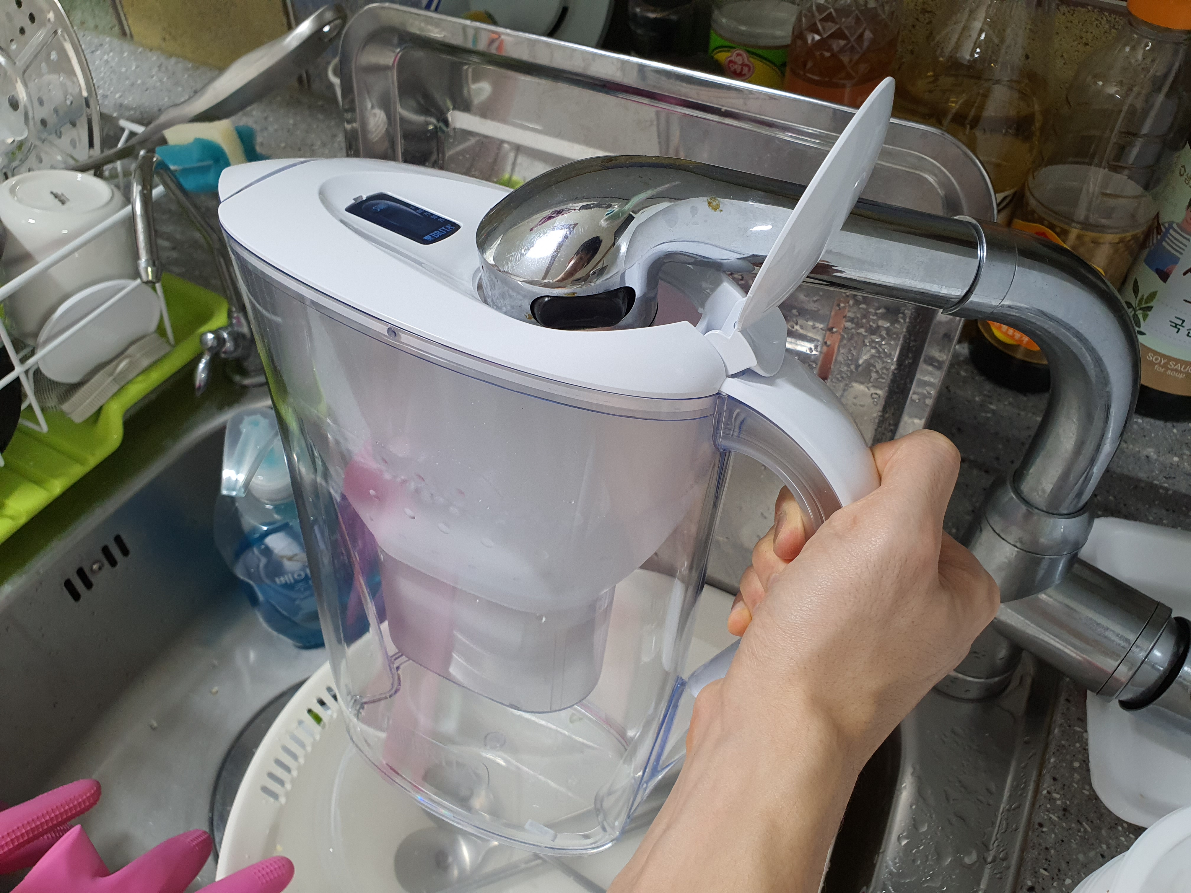필터 장착 후에 물을 이렇게 부어주면 필터를 타고 내려와 정화된 물을 마실 수 있게 된다.