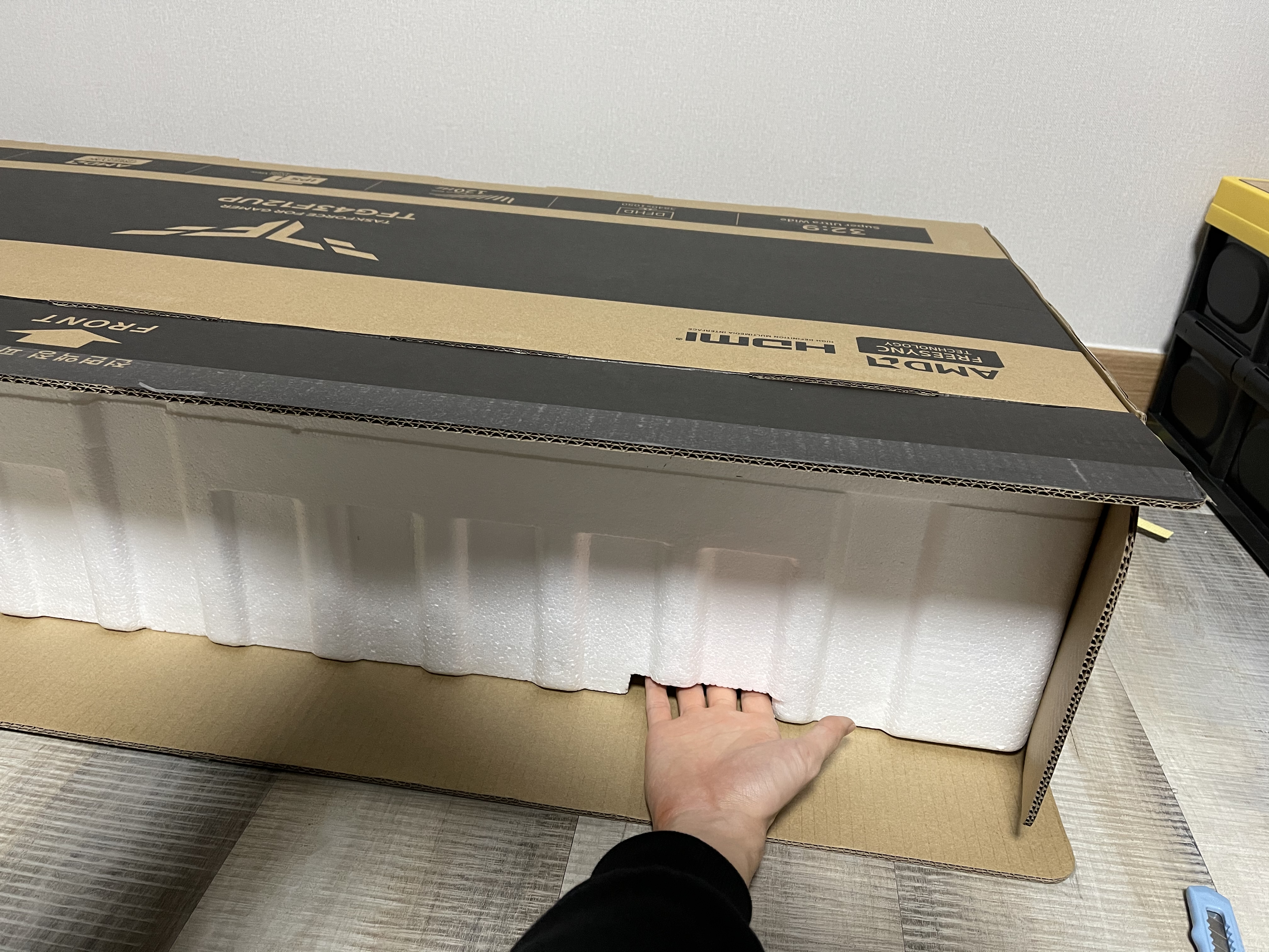 빈틈에 손을 넣고 당겨주면 모니터를 감싸고 있는 스티로폼이 통째로 밖으로 나온다.