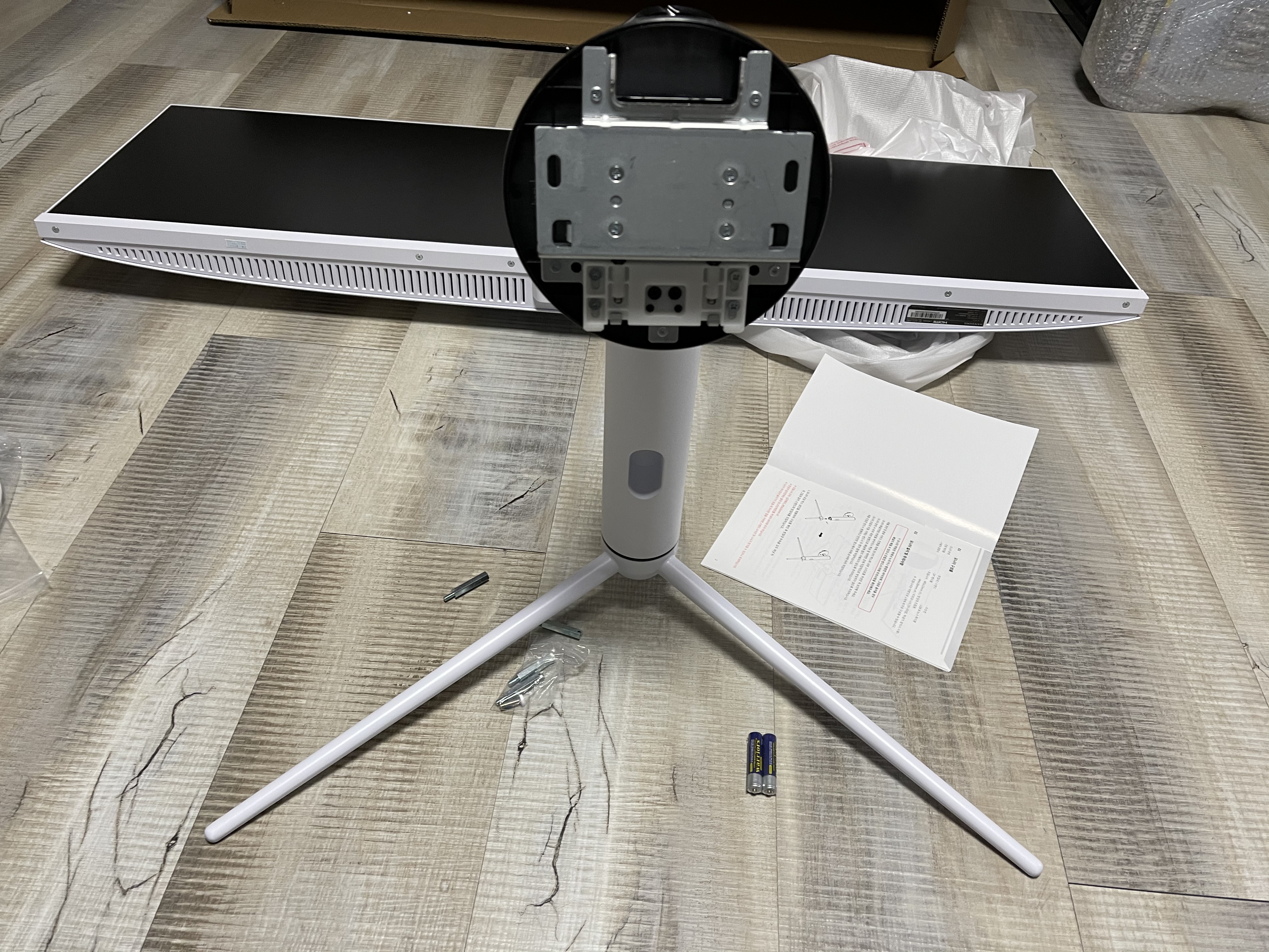 위 사진은 모니터의 구성품들이다. 모니터 받침대, 전원케이블, 리모컨, 설명서 등이 들어있다.