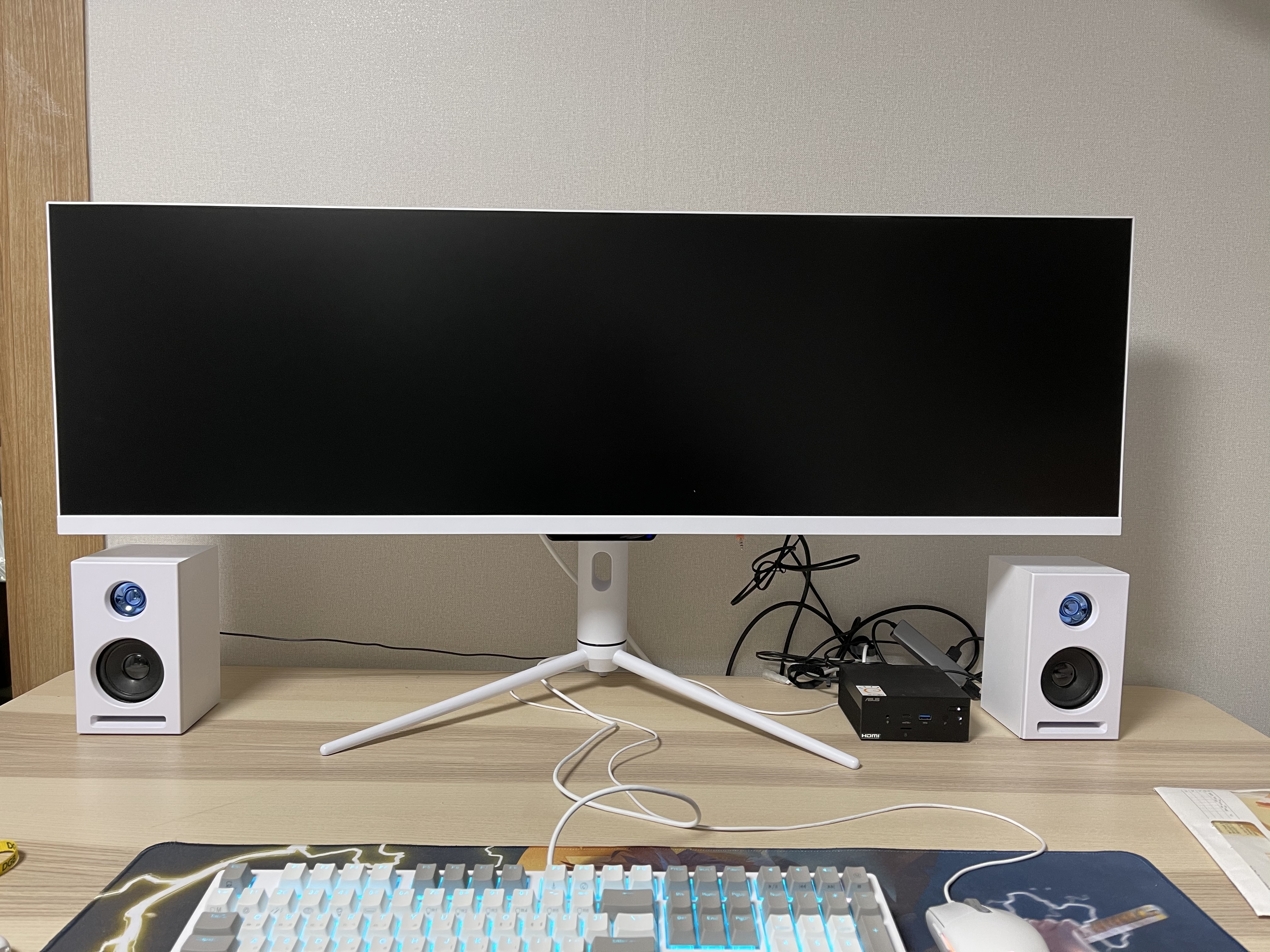 책상위에 올려둔 모습이다. 화이트 키보드, 화이트 마우스, 화이트 스피커, 화이트 모니터 깔 맞춤된 느낌이라 상당히 마음에 든다.