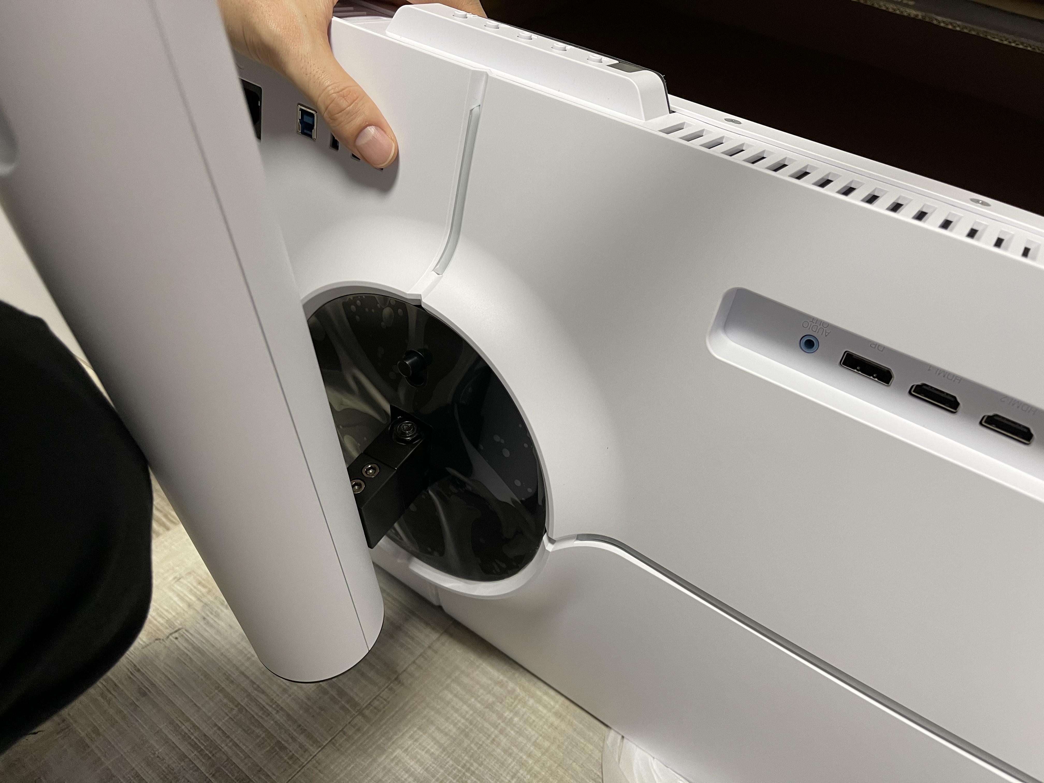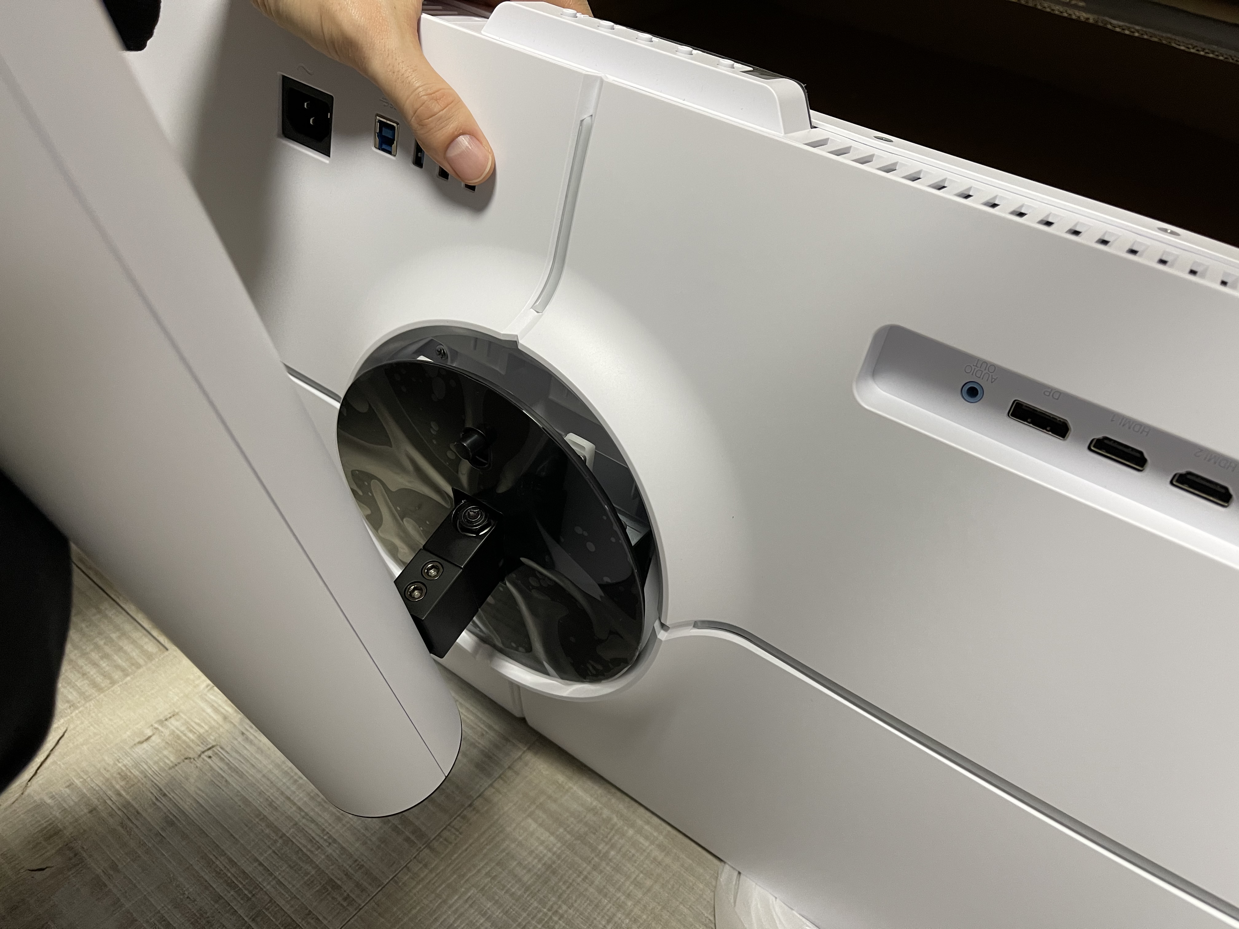 그다음 모니터 아래쪽 방향 부분까지 밀어넣으면 딸깍 소리가 나면서 결착된다.
