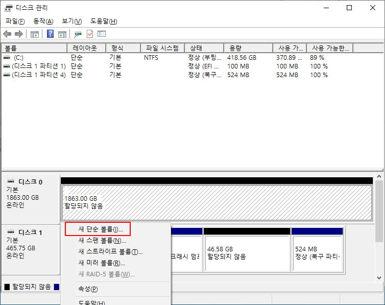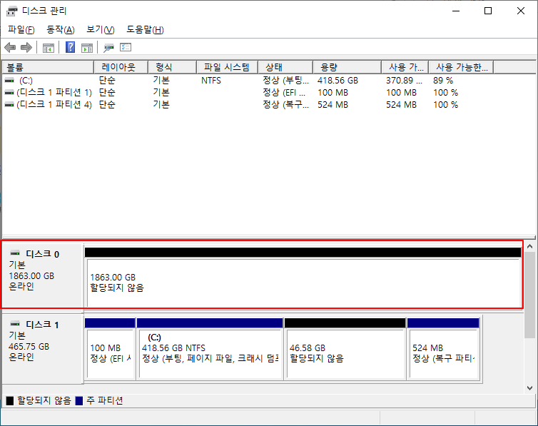 디스크0을 보면 할당되지 않음이라고 적혀있는 것을 볼 수 있다.