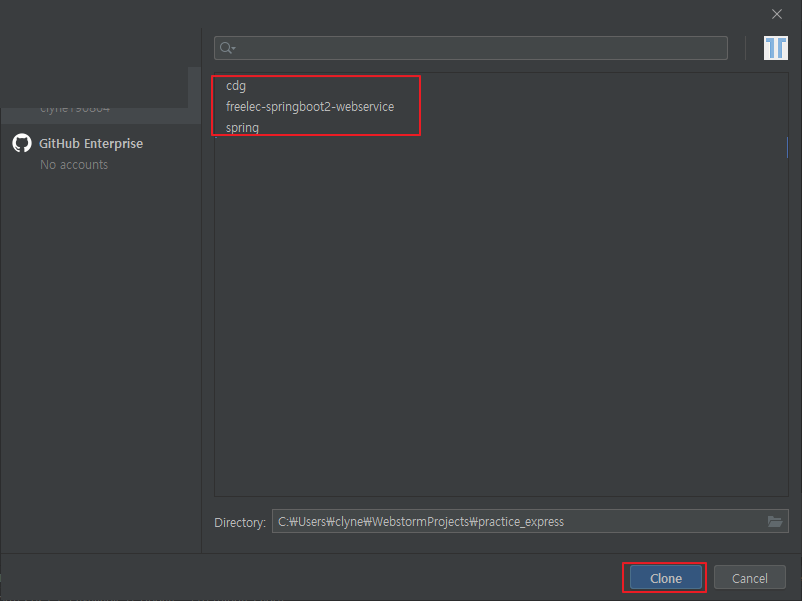 웹스톰에 본인 계정에 생성되어있는 프로젝트 목록들이 나타난다.